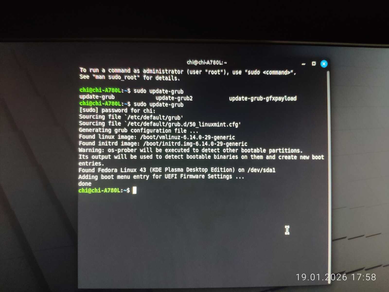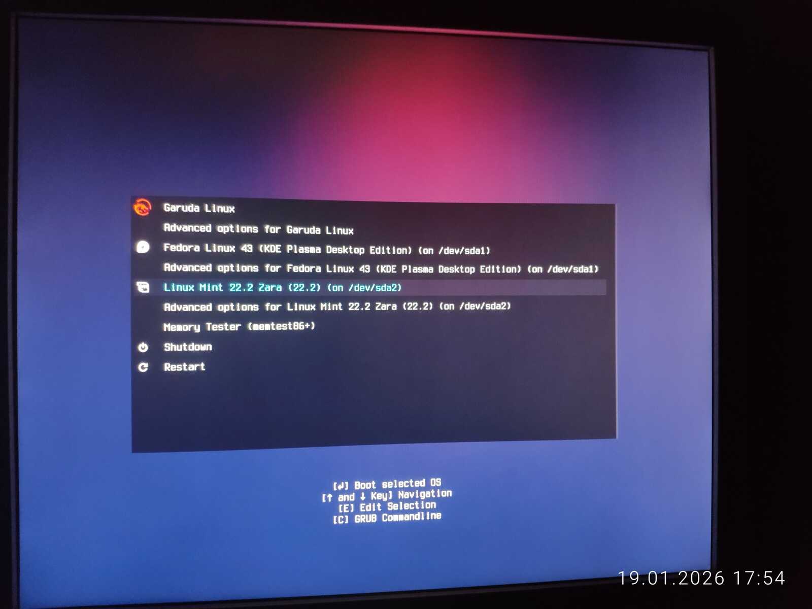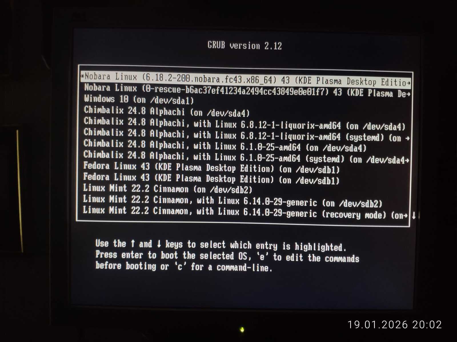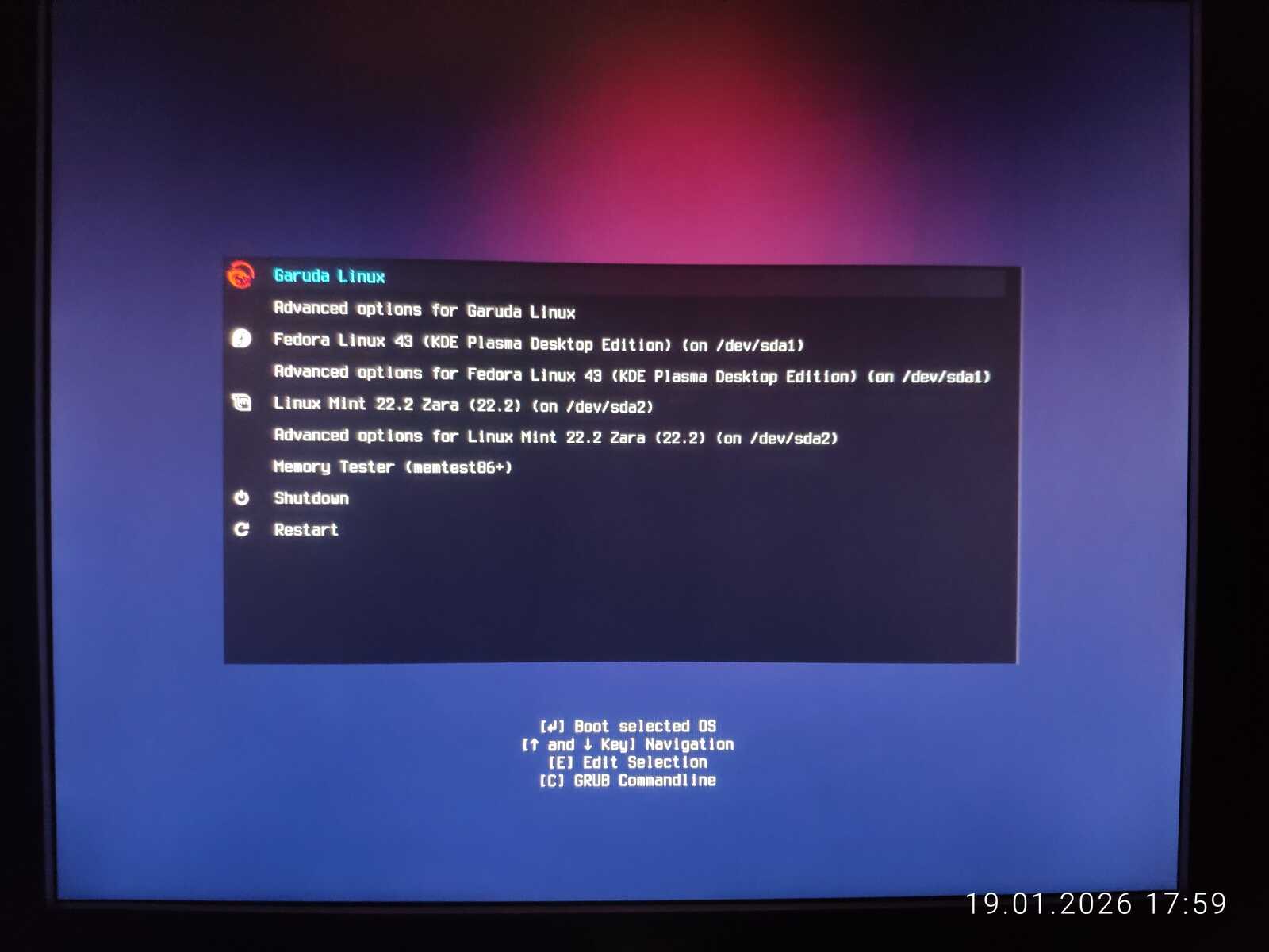 Попытался обновить загрузчик в дистрибутиве Garuda. Он даже увидел Nobara Linux, но загрузочное меню никак не поменялось. То же проделал в Linux Mint с таким же результатом. Потом подключил второй жёсткий диск и обновил загрузчик в дистрибутиве Chimbalix. Nobara не определилась. Но загрузочное меню, наконец, поменялось. Правда, добавилась только Fedora и Mint. Похоже, у Garuda Linux специфический GRUB, как и у Nobara. Ещё пытался обновить загрузчик в дистрибутиве Fedora, но тоже безрезультатно.