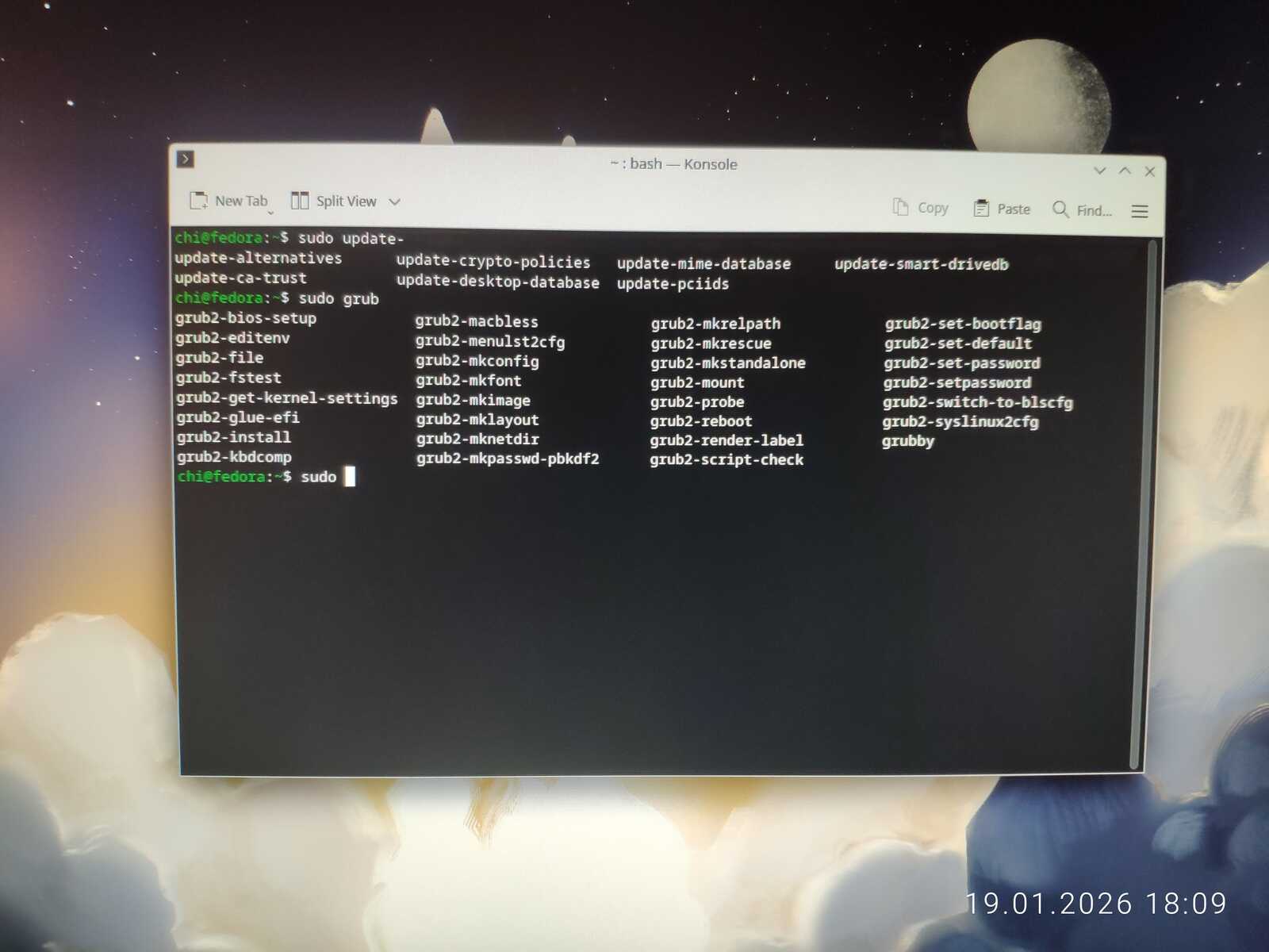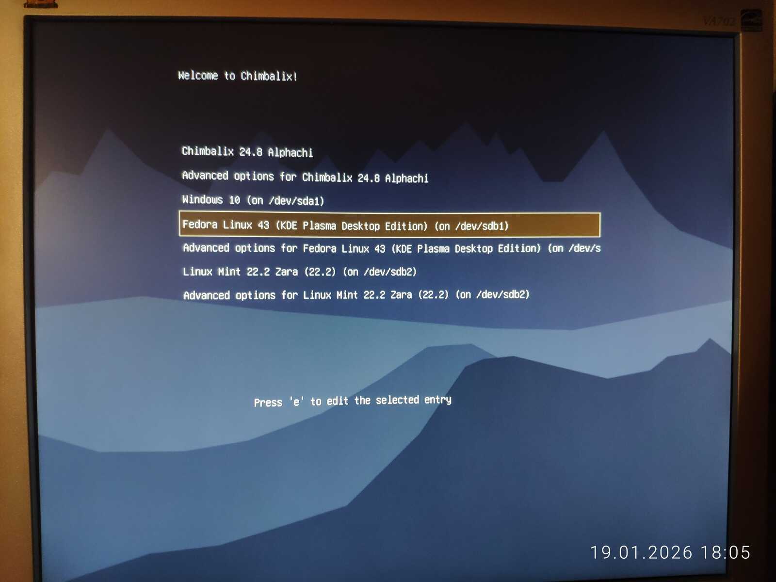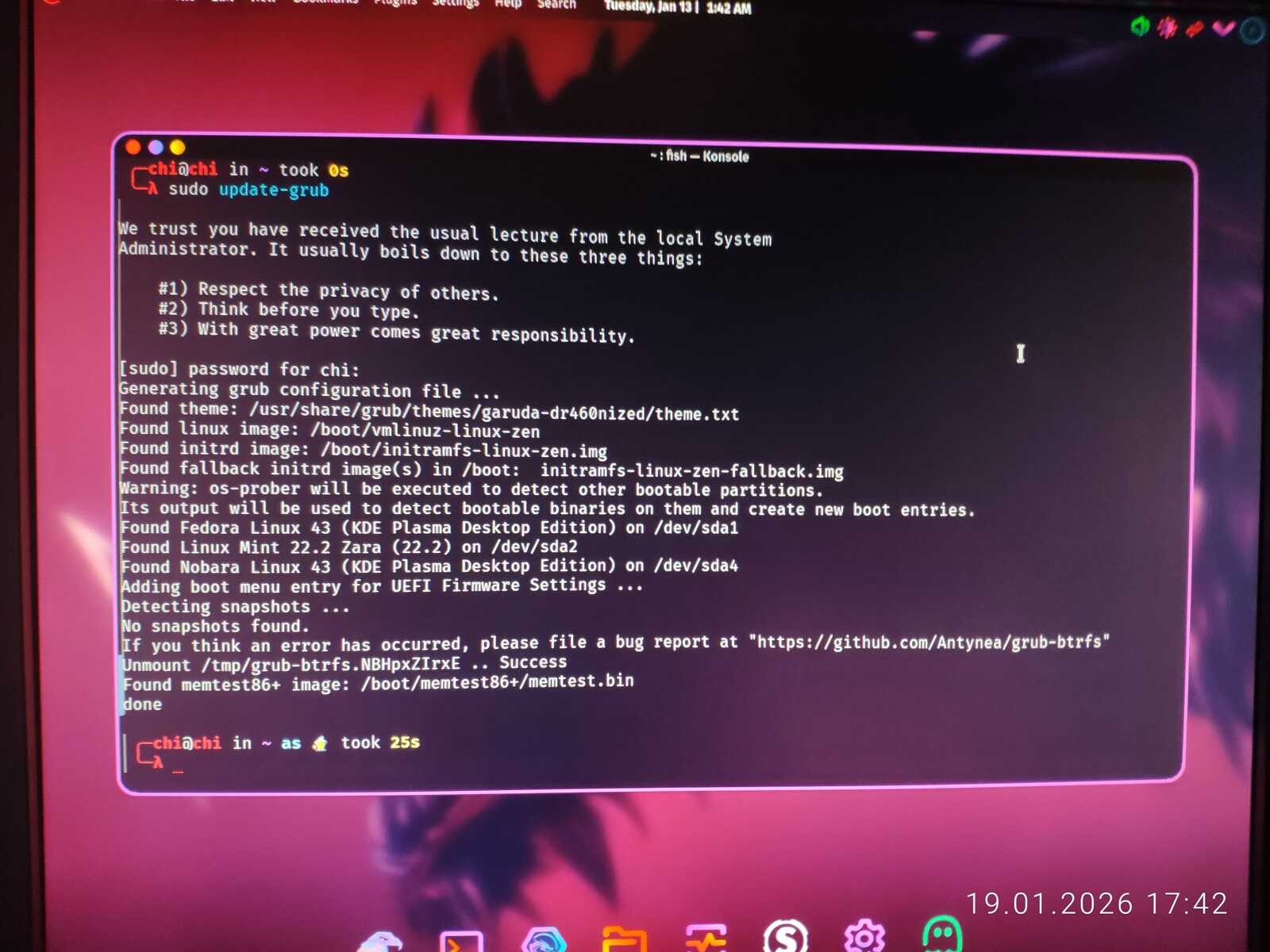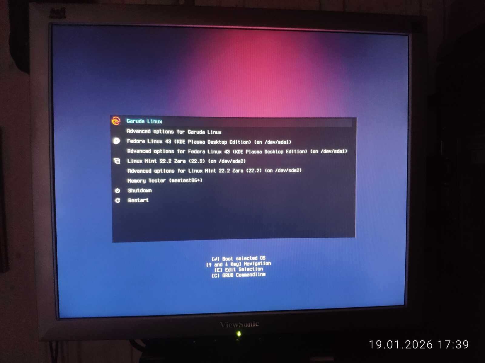 Попытался обновить загрузчик в дистрибутиве Garuda. Он даже увидел Nobara Linux, но загрузочное меню никак не поменялось. То же проделал в Linux Mint с таким же результатом. Потом подключил второй жёсткий диск и обновил загрузчик в дистрибутиве Chimbalix. Nobara не определилась. Но загрузочное меню, наконец, поменялось. Правда, добавилась только Fedora и Mint. Похоже, у Garuda Linux специфический GRUB, как и у Nobara. Ещё пытался обновить загрузчик в дистрибутиве Fedora, но тоже безрезультатно.