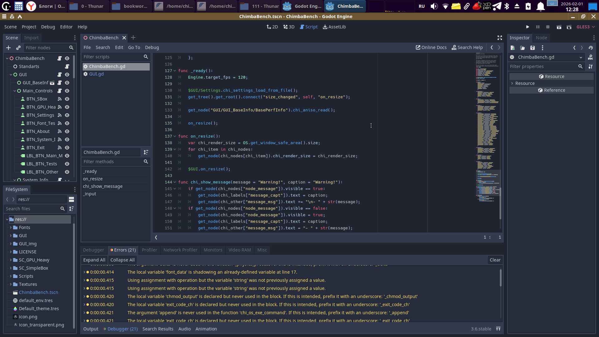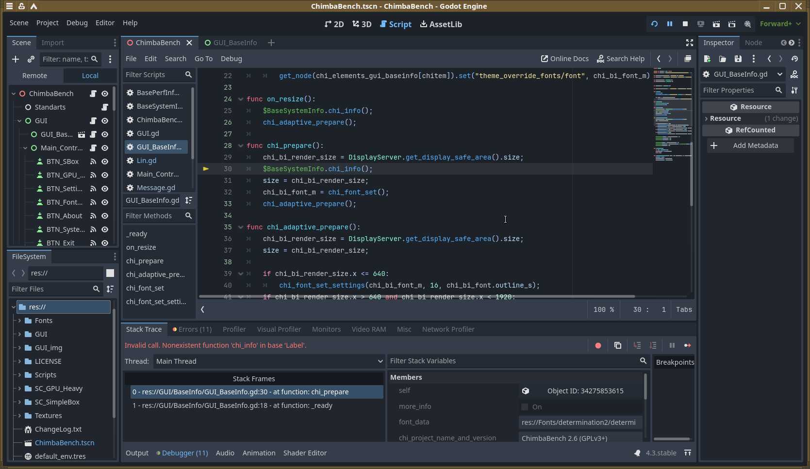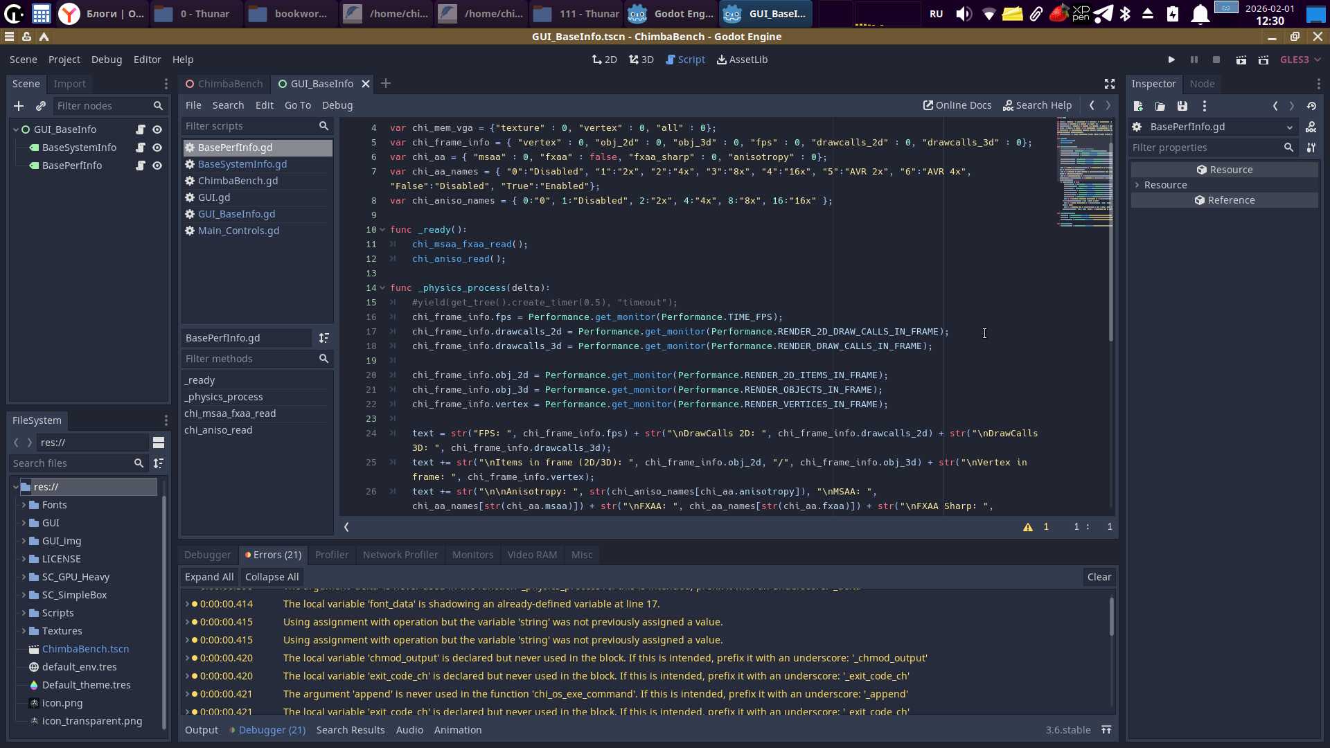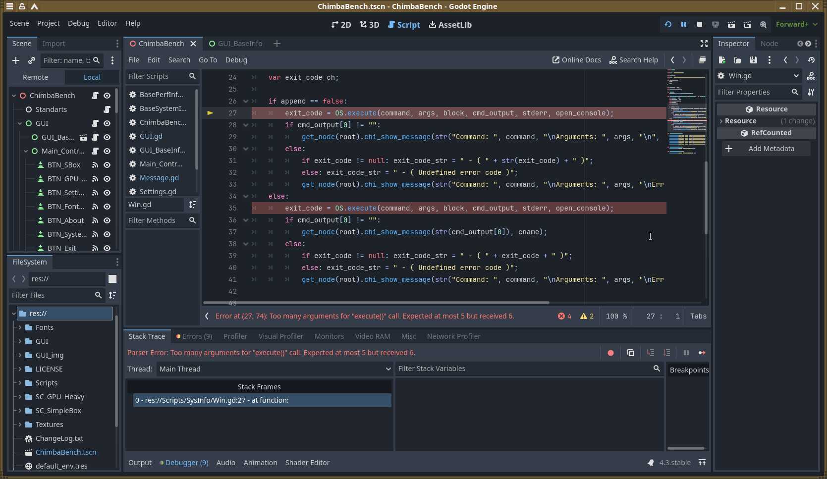 Помимо визуальных проявлений, есть и технические. Теперь не работают ограничения fps в нужных местах. Но это мелочи. Куда страшнее поломанные функции запуска сторонних утилит, благодаря которым осуществлялся запуск утилит для сбора и показа информации о системе. До кучи имеем ошибки «Invalid Call» на ровном месте, потому что Godot Engine сильно изменился, а преобразование проектов не работает должным образом.