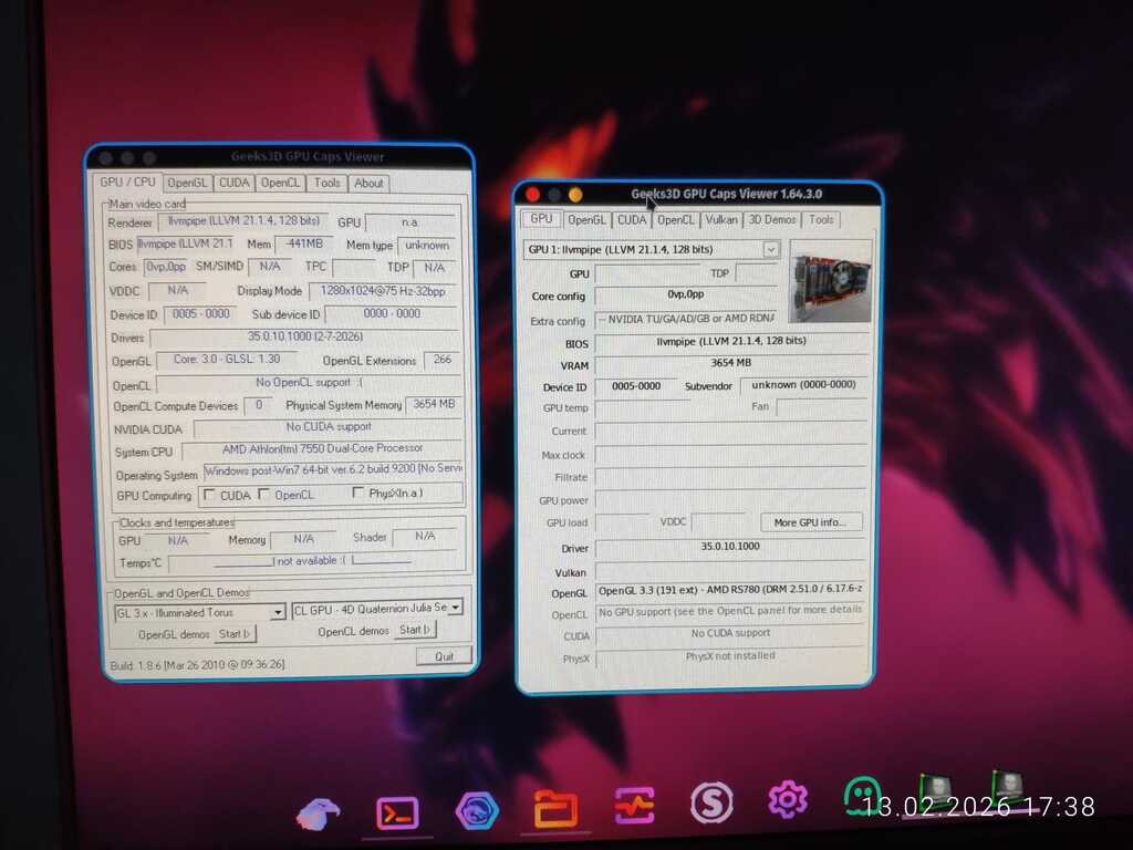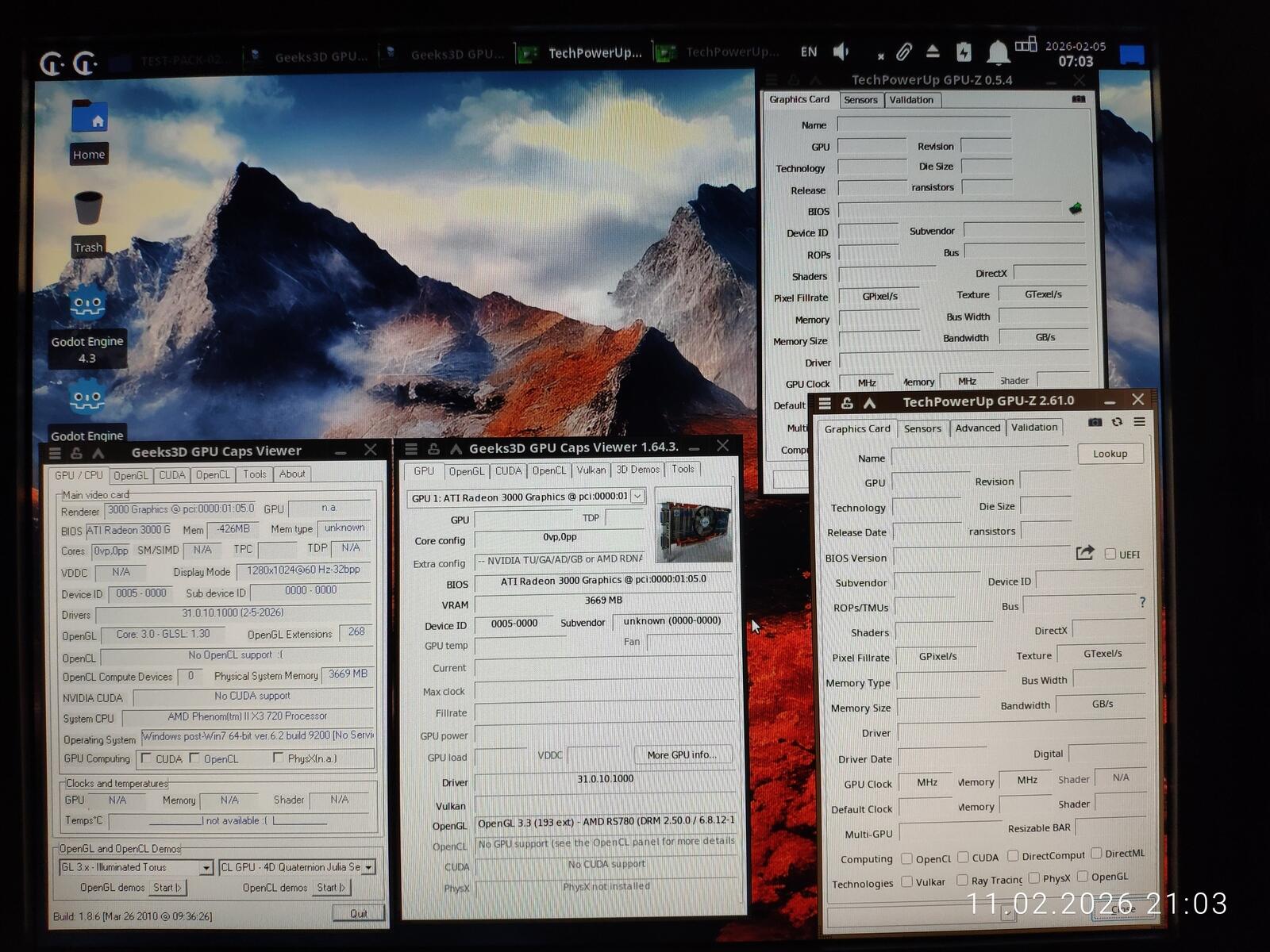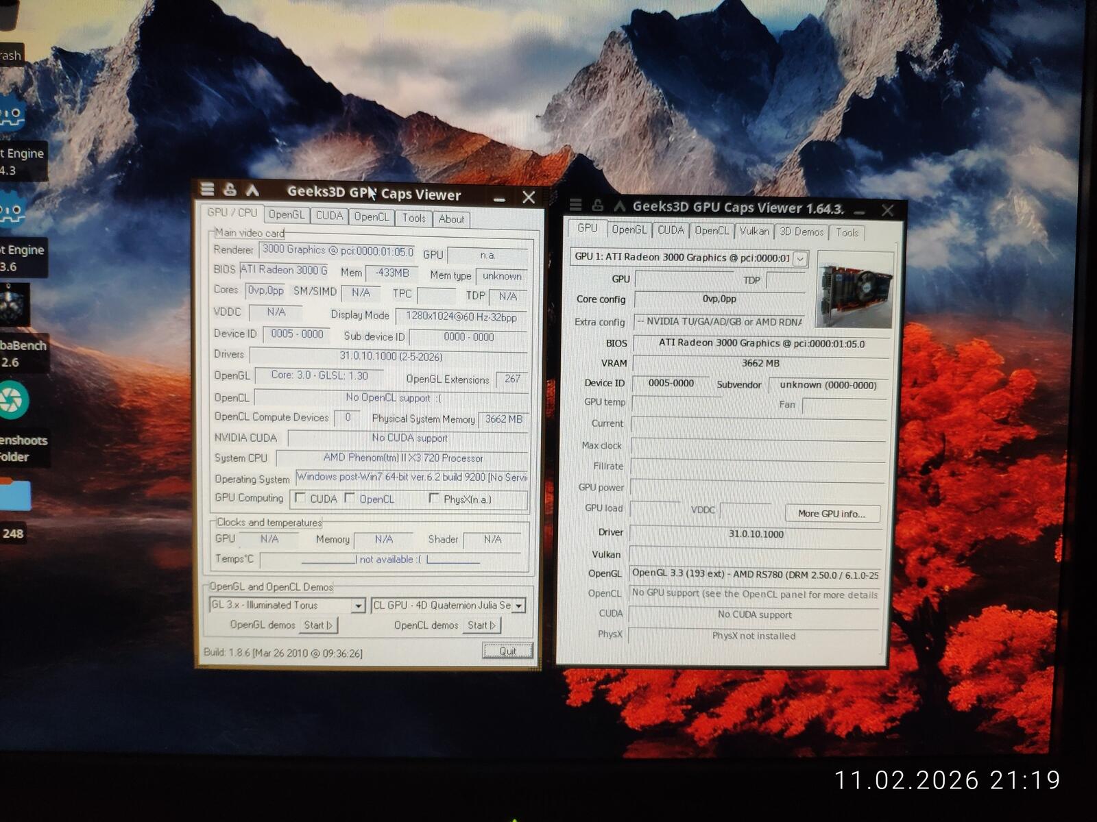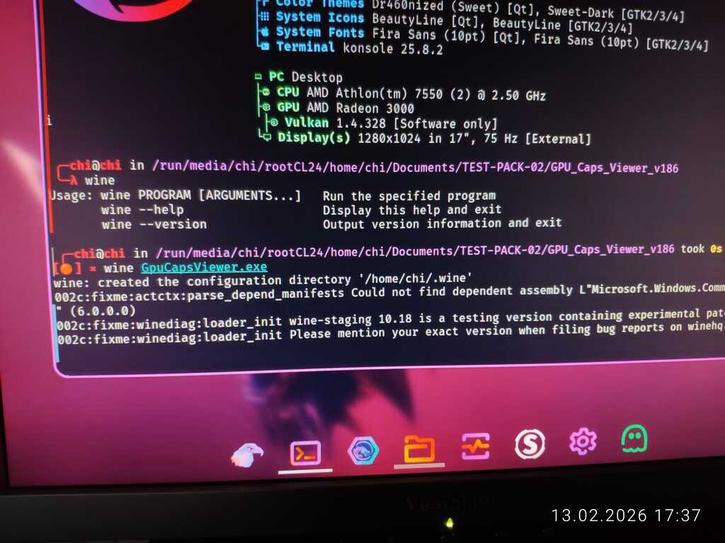 Я уже и забыл, что по умолчанию в дистрибутиве Chimbalix используется DXVK для трансляции DirectX в Vulkan API. Разумеется, Radeon 3100 не поддерживает Vulkan, потому вместо неё трудился процессор под именем Radeon RX 6700 XT. Но даже переключив DXVK на DXGL (WineD3D) я получил всего 9 fps в разрешении 640x480. Было очень неприятно, так как в среде Windows уже собрал результаты на уровне 17 fps при разрешении 800x600. Однако видеокарта настолько слабая, что я замучаюсь ждать результаты в среде Linux даже при разрешении 640x480. Так что будем думать над тестовыми условиями.