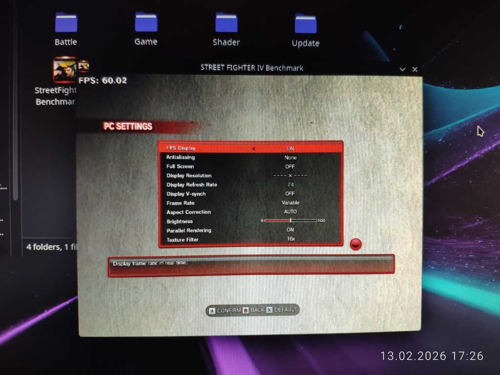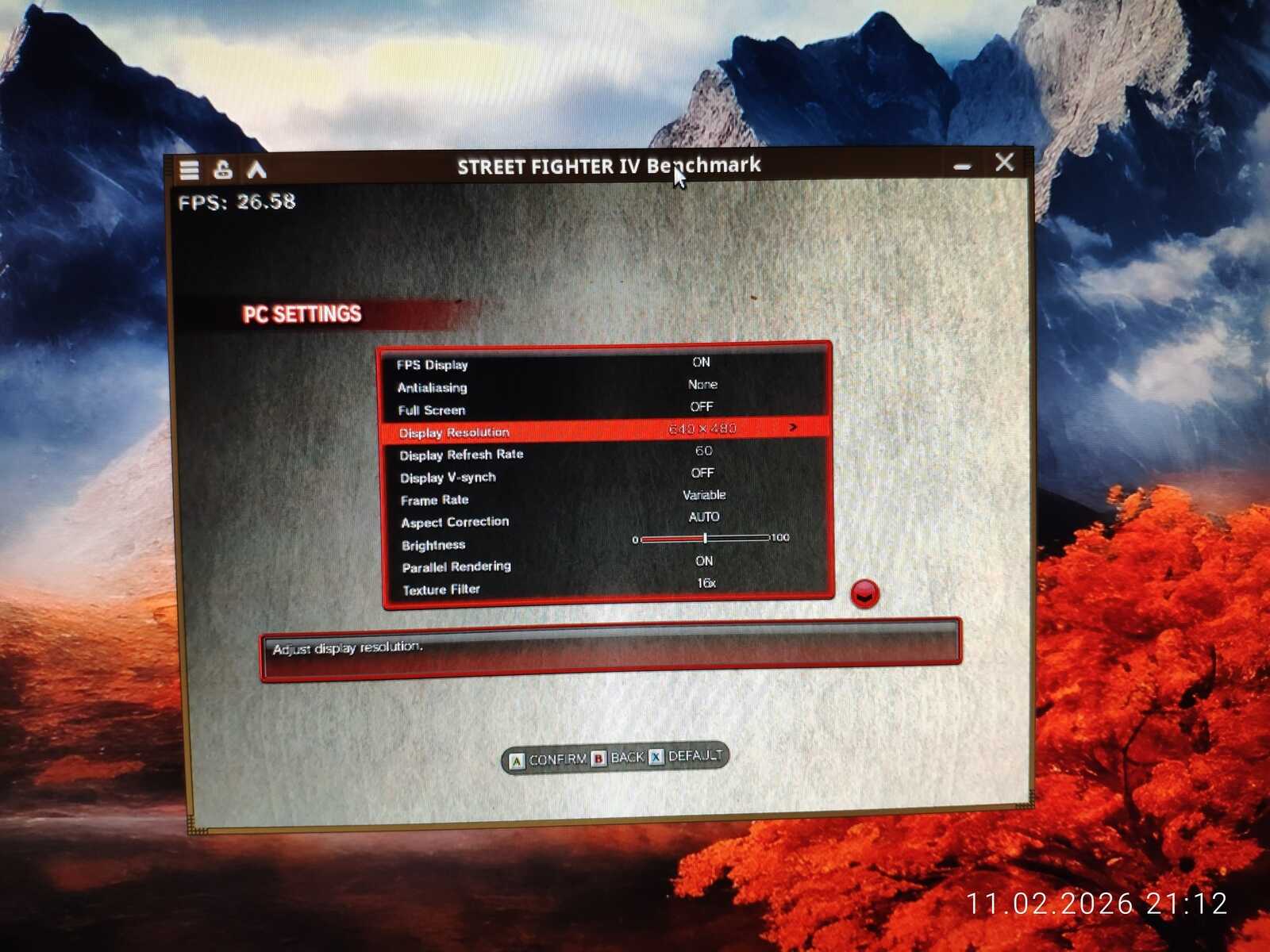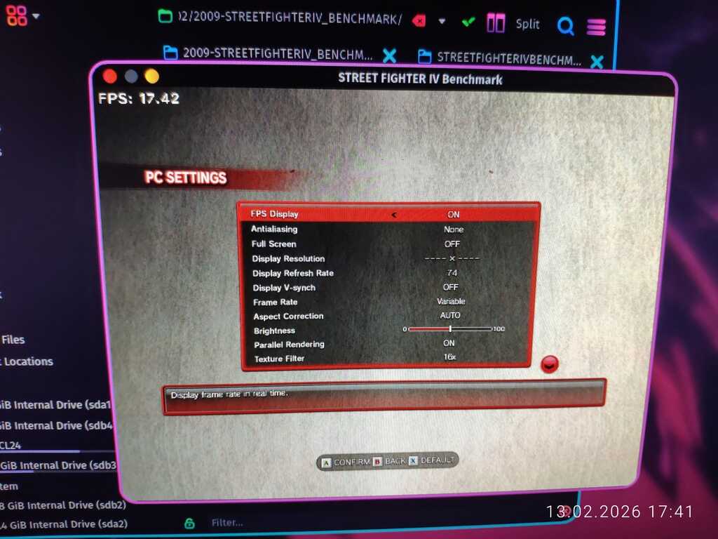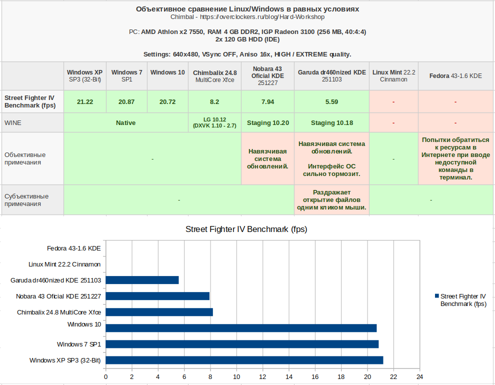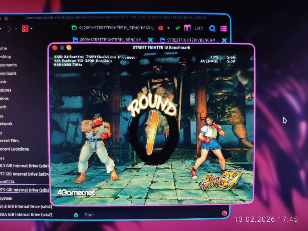Хотя в среде Linux результат немного завышен, так как я не доводил тесты до конца, ибо слишком много времени займёт при такой низкой производительности. Но таков уж Street Fighter IV. Это одна из причин, почему я начал разработку нового бенчмарка.