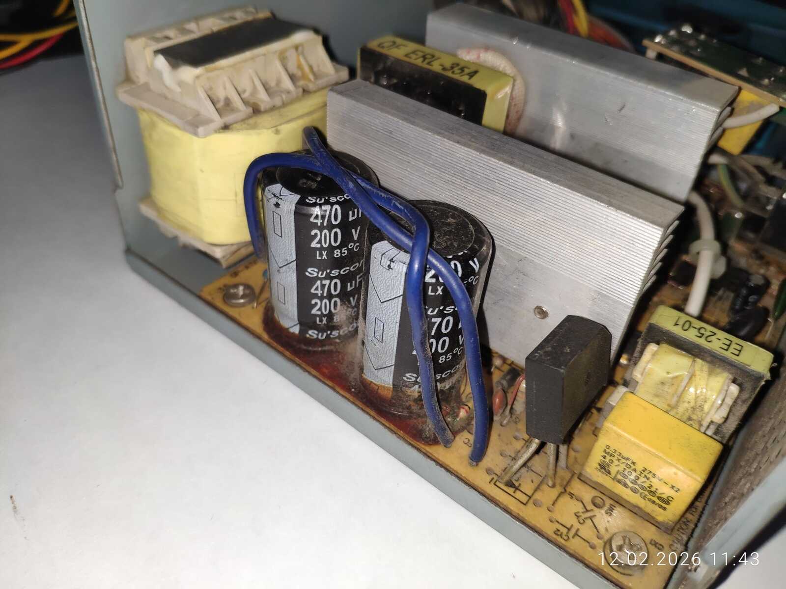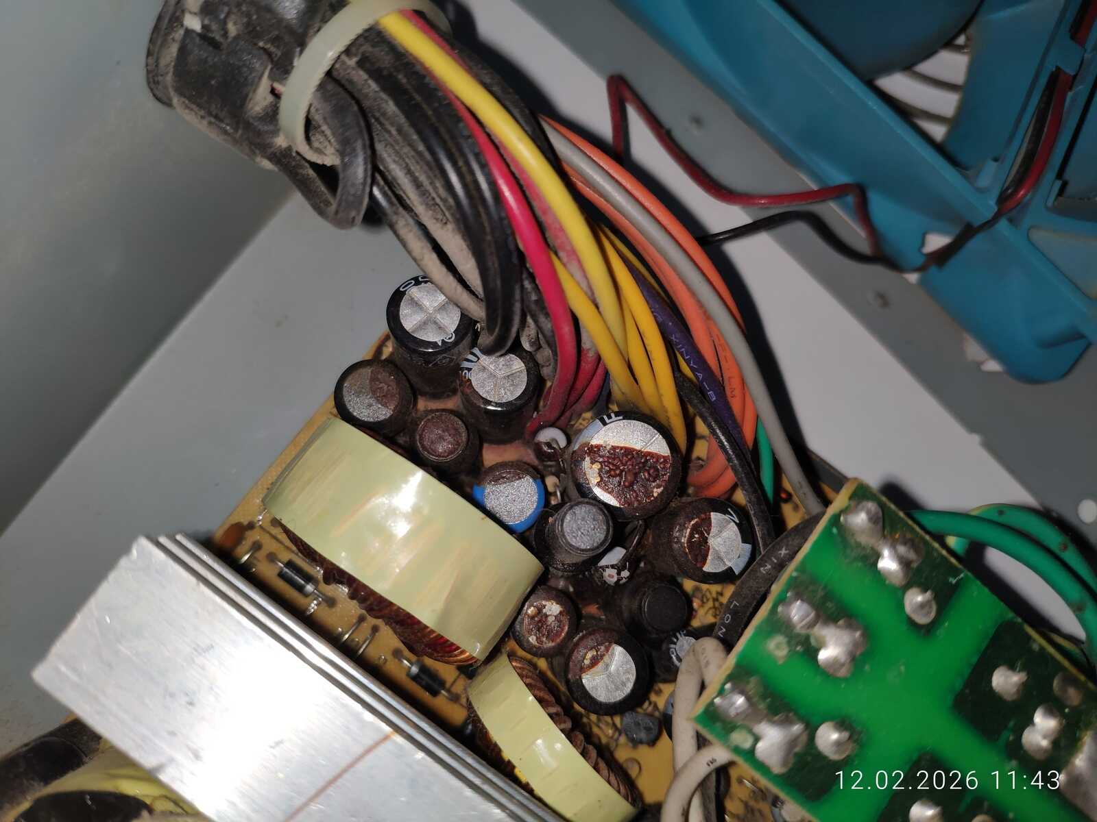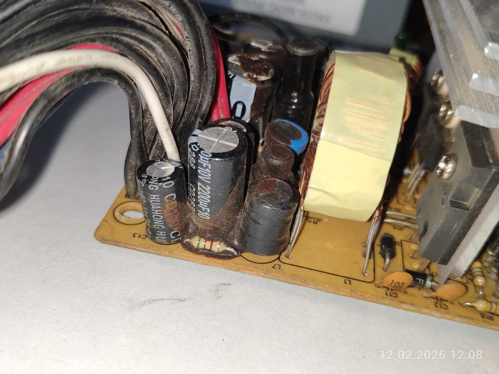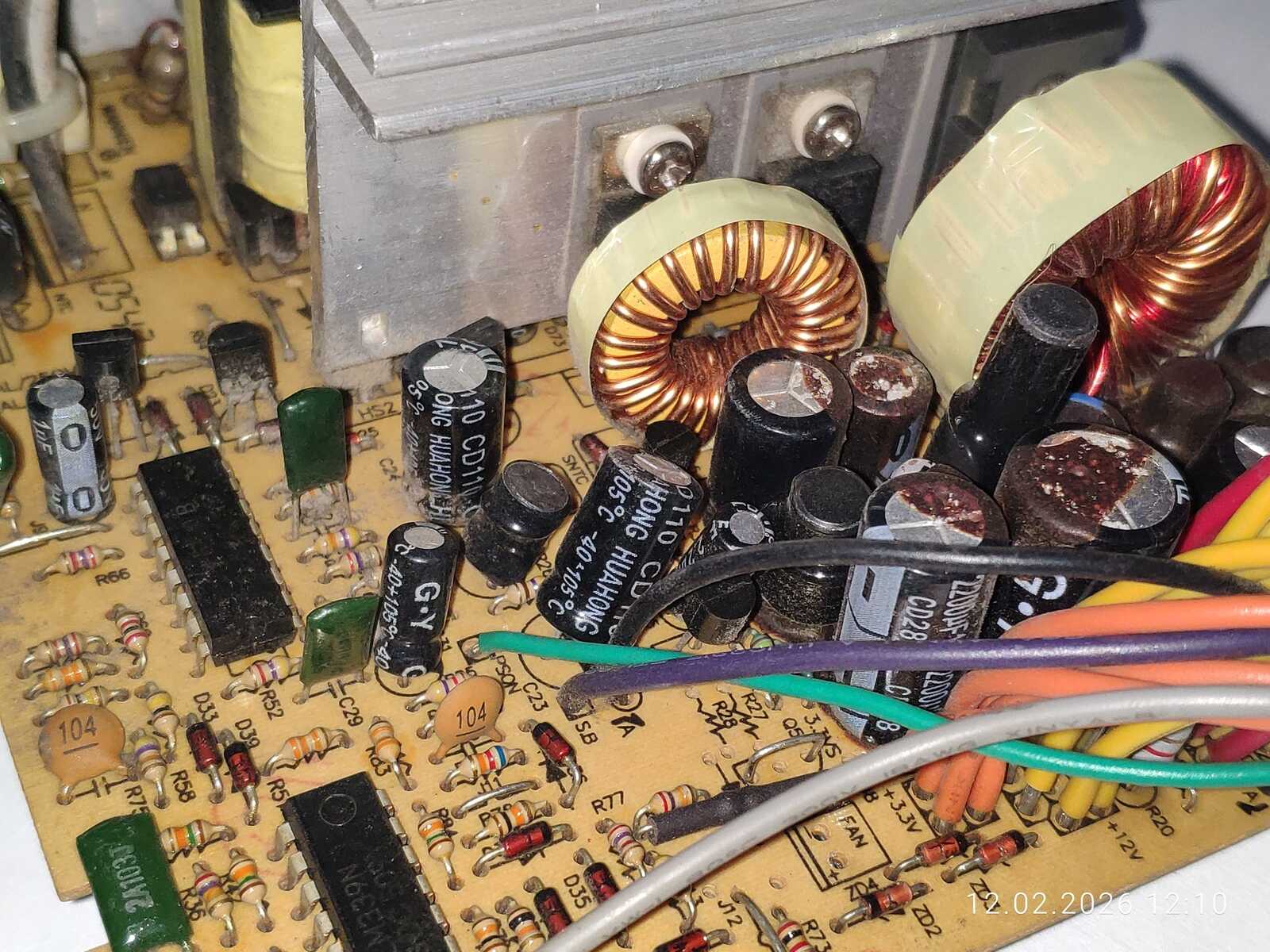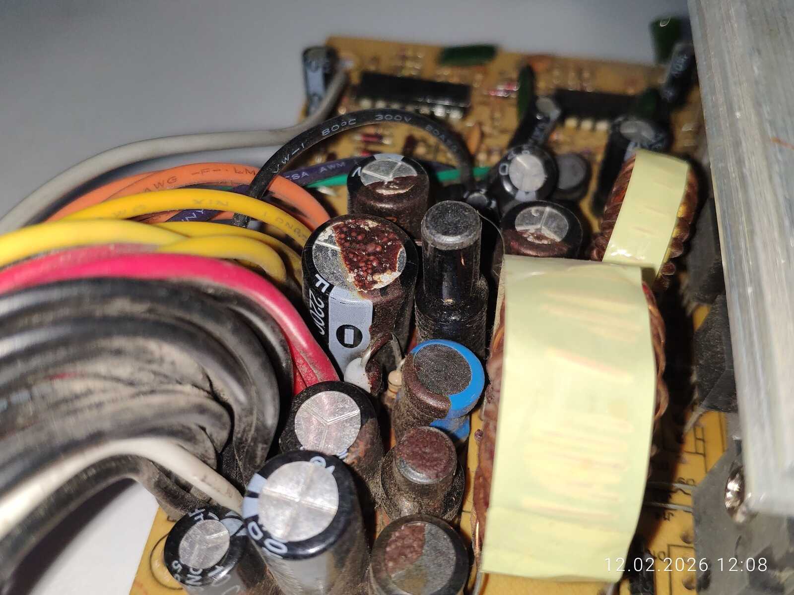Начинаем с блока питания, что был произведён в конце 2005 года. Сразу же смотрю на два больших конденсатора. Видны следы коричневого клея, но ничего подозрительного.