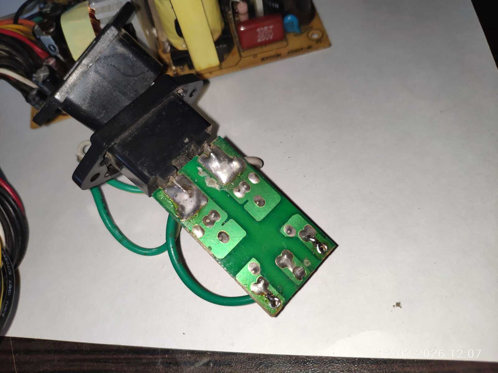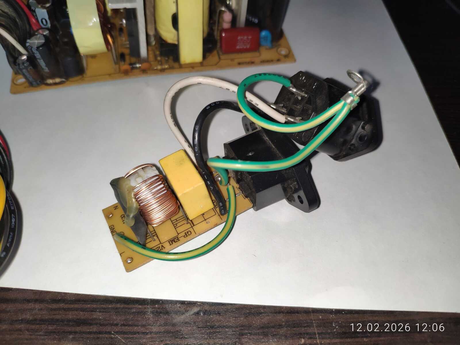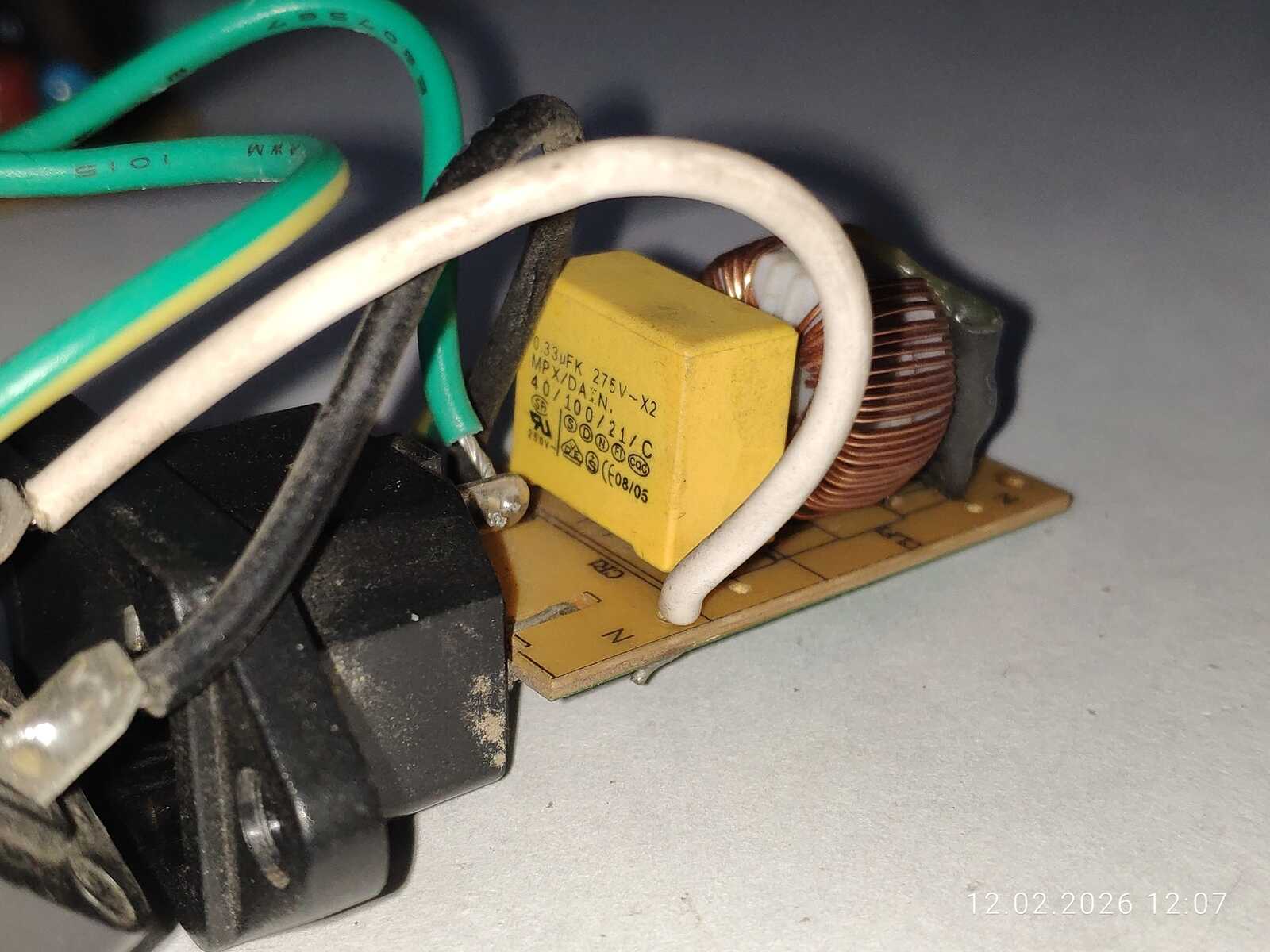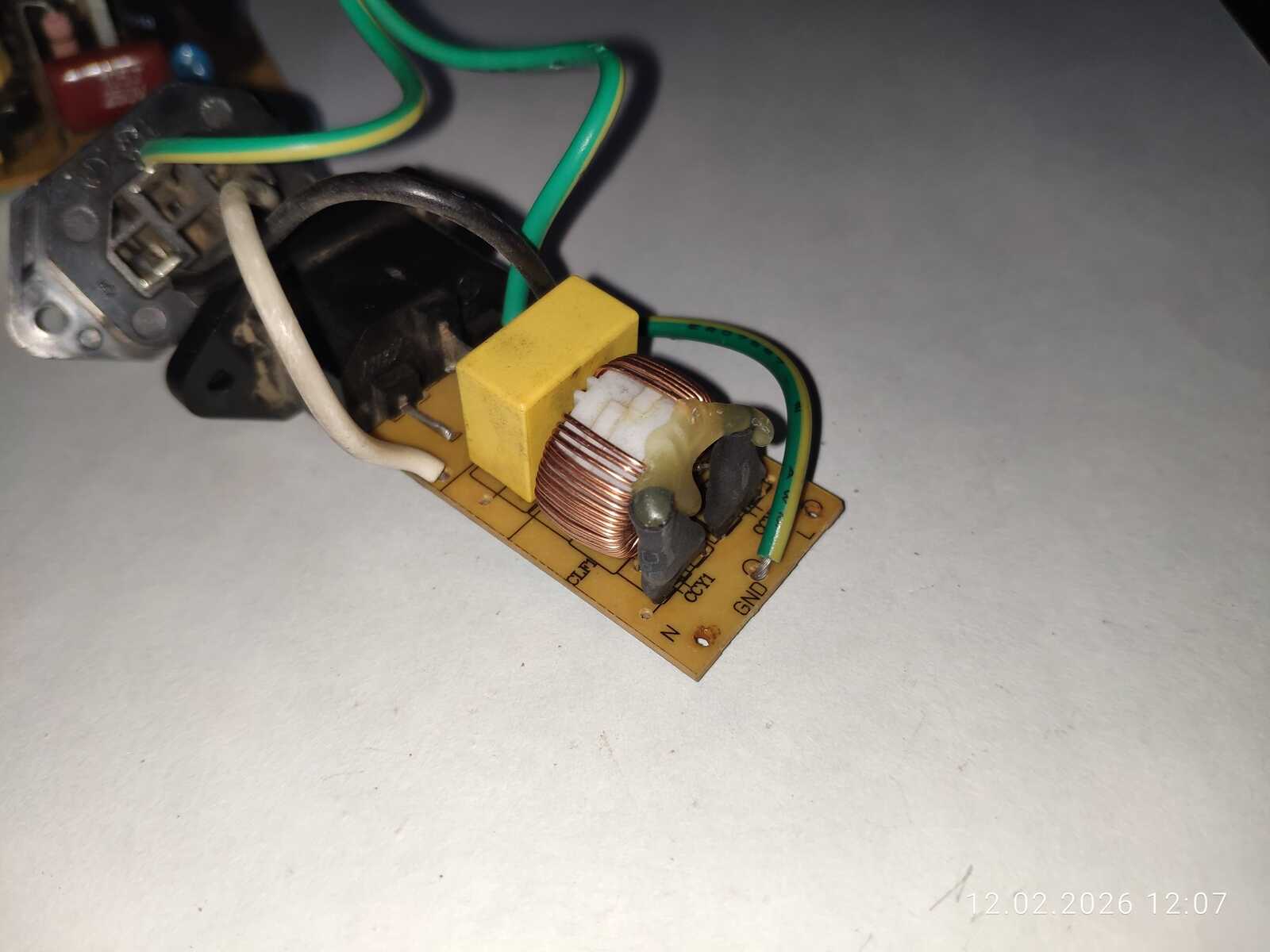 Так же пришлось отпаять первый входной фильтр классической конструкции из сдвоенного дросселя подавления ЭМП и конденсатором X2. Из примечательного можно отметить розетку для цепного подключения дополнительных устройств к электросети.