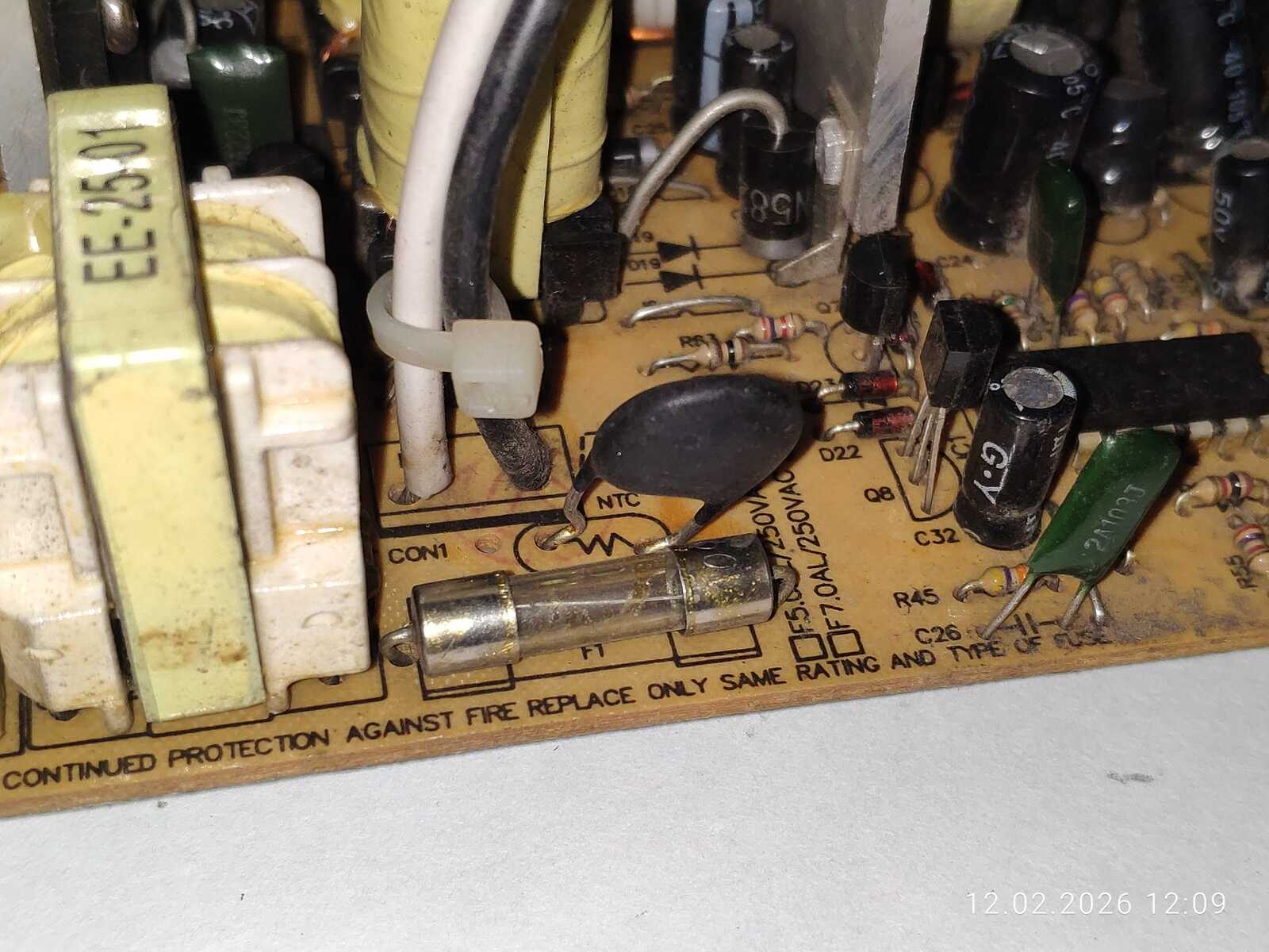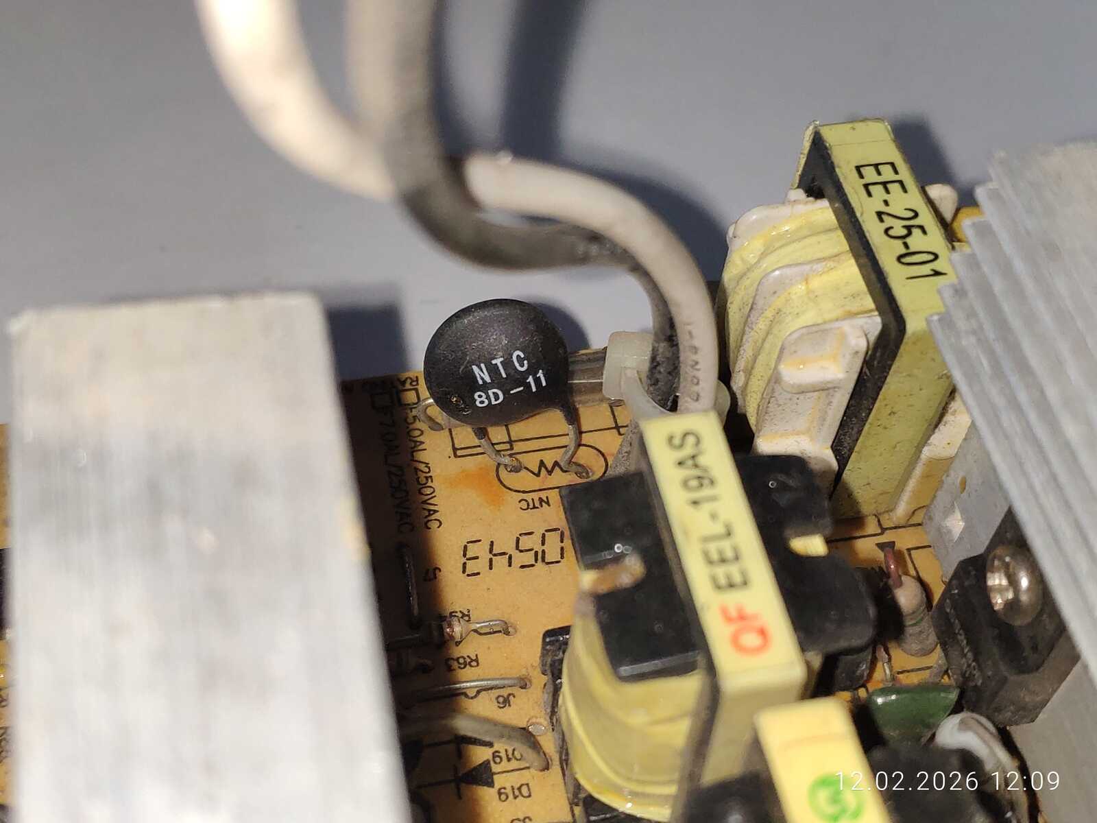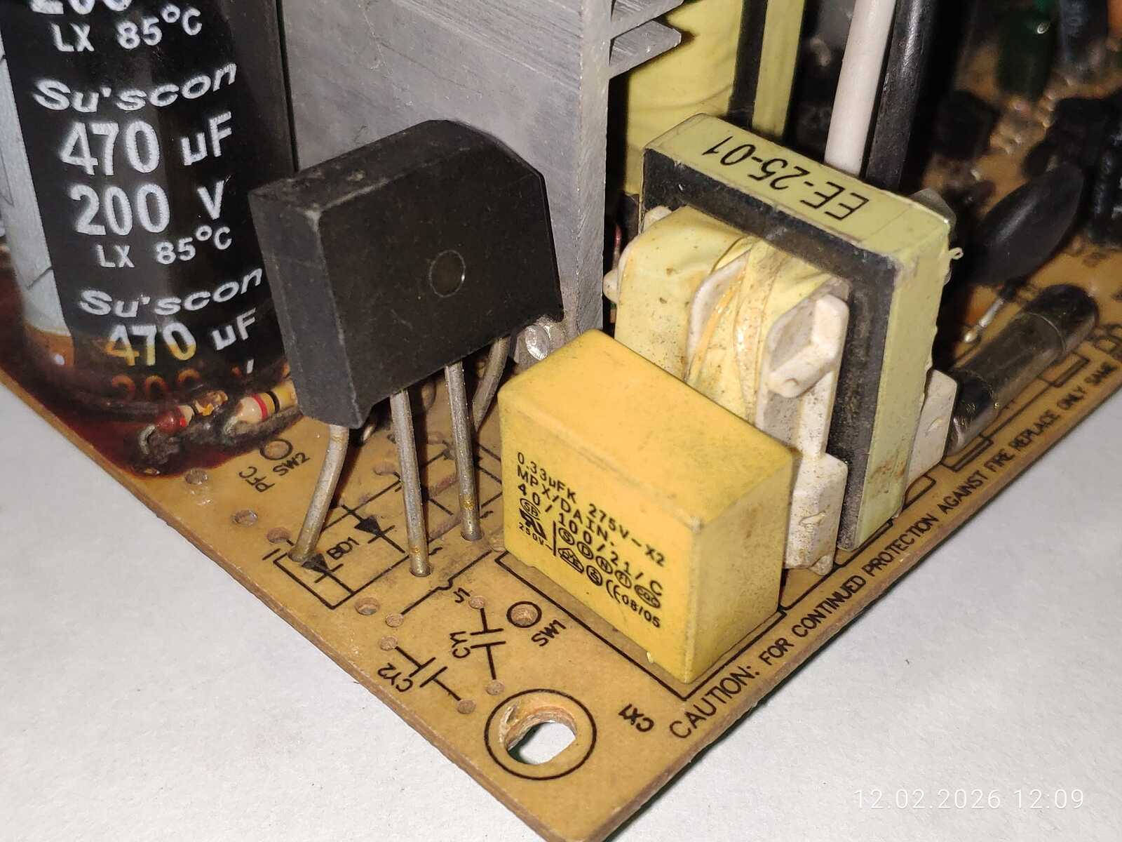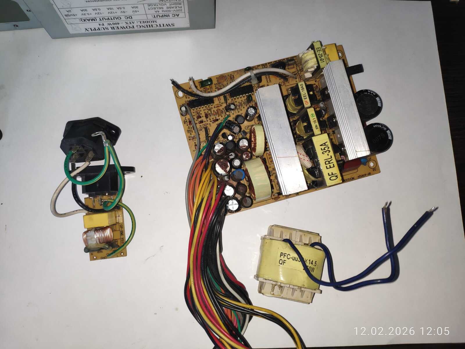 Так же пришлось отпаять первый входной фильтр классической конструкции из сдвоенного дросселя подавления ЭМП и конденсатором X2. Из примечательного можно отметить розетку для цепного подключения дополнительных устройств к электросети.