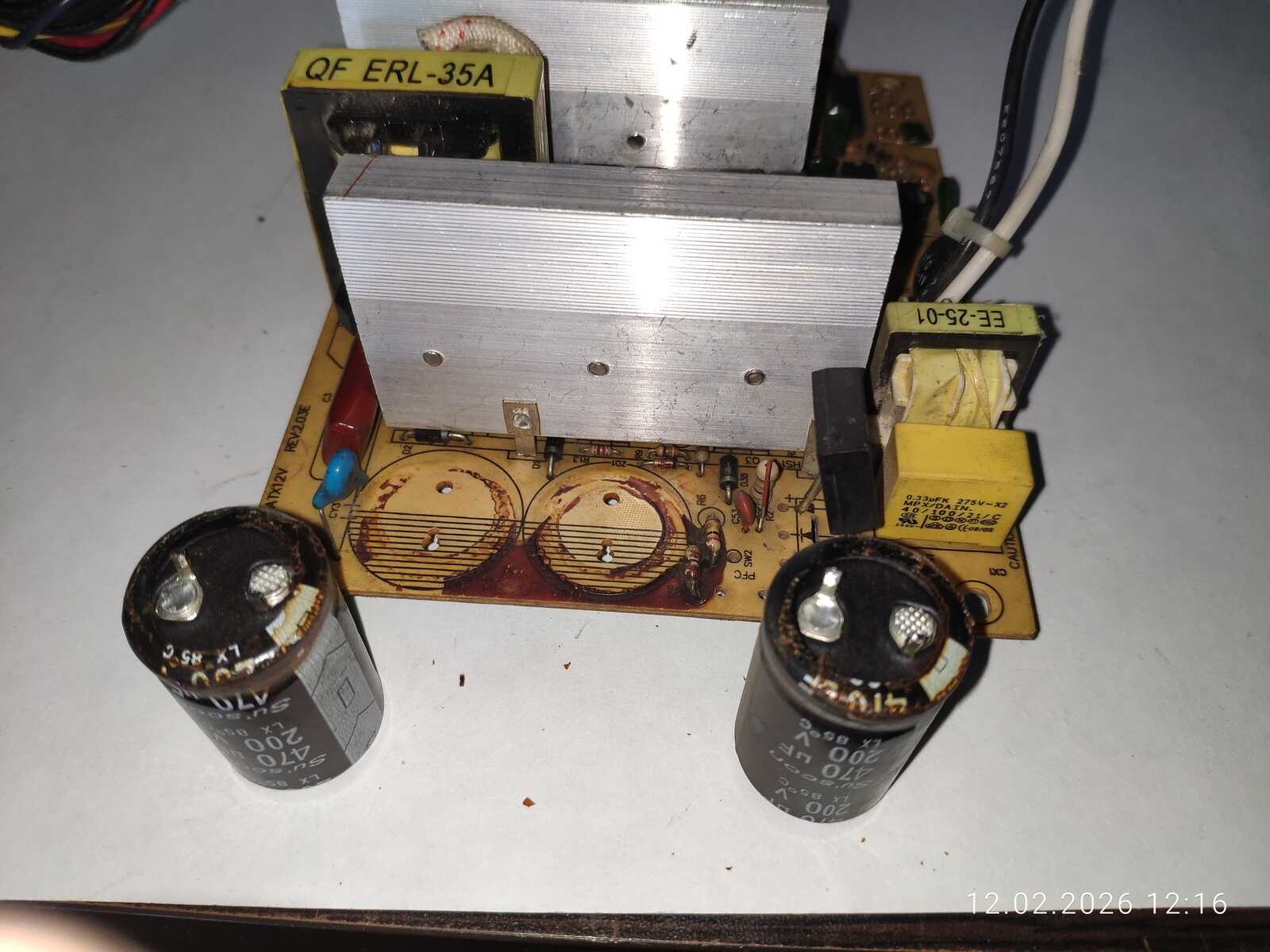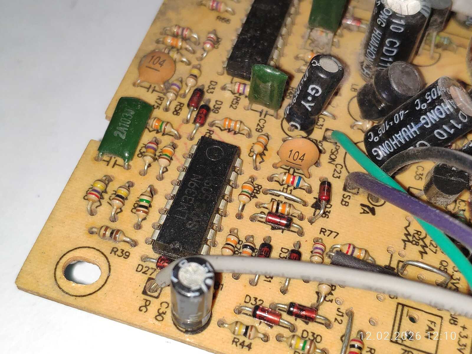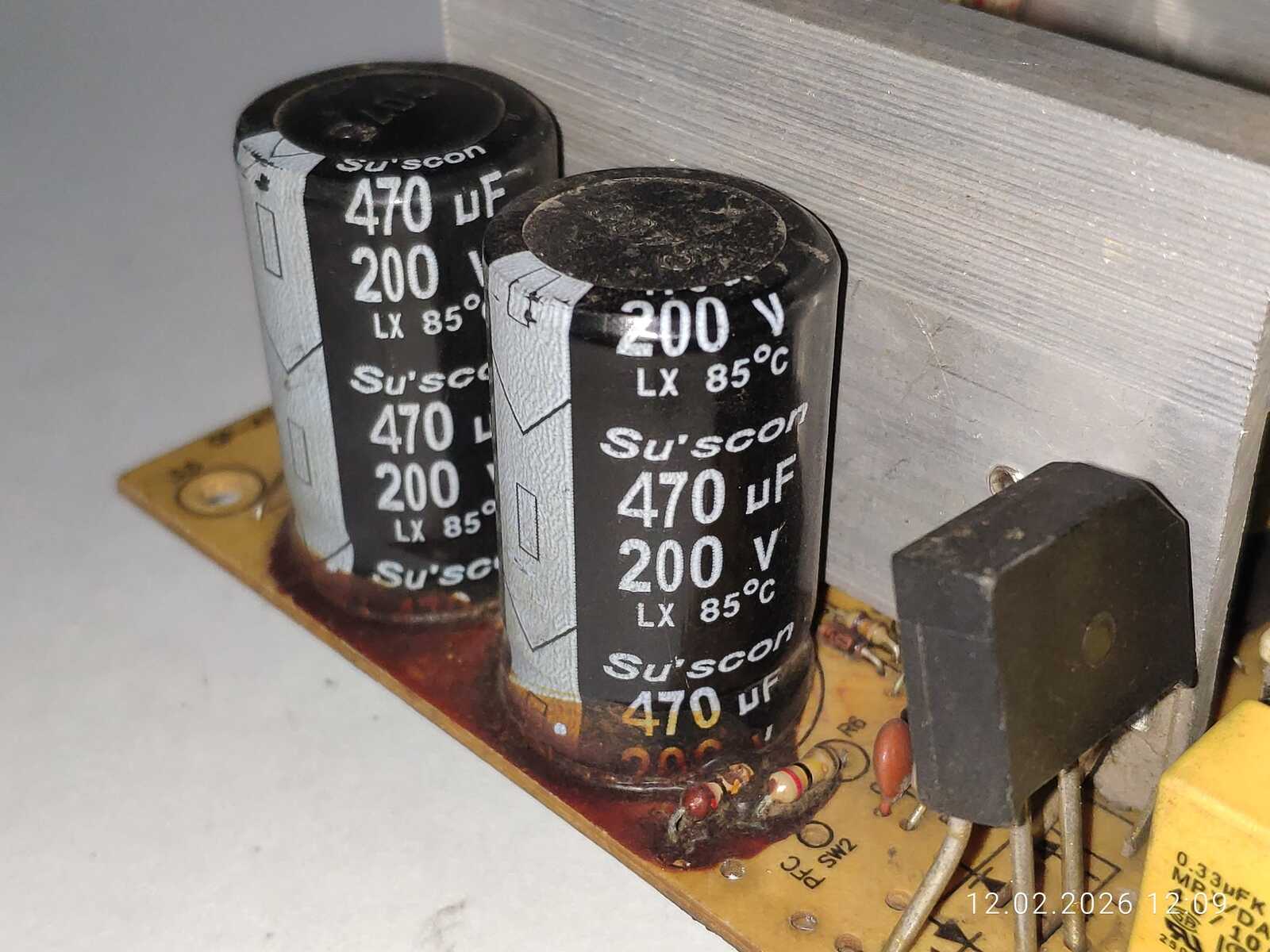 Заменил только конденсатор на 2200 мкФ более ёмким. Всё же выглядит он уже не очень хорошо, будто подгорел. Хотя это просто заводской клей испортился за двадцать лет.