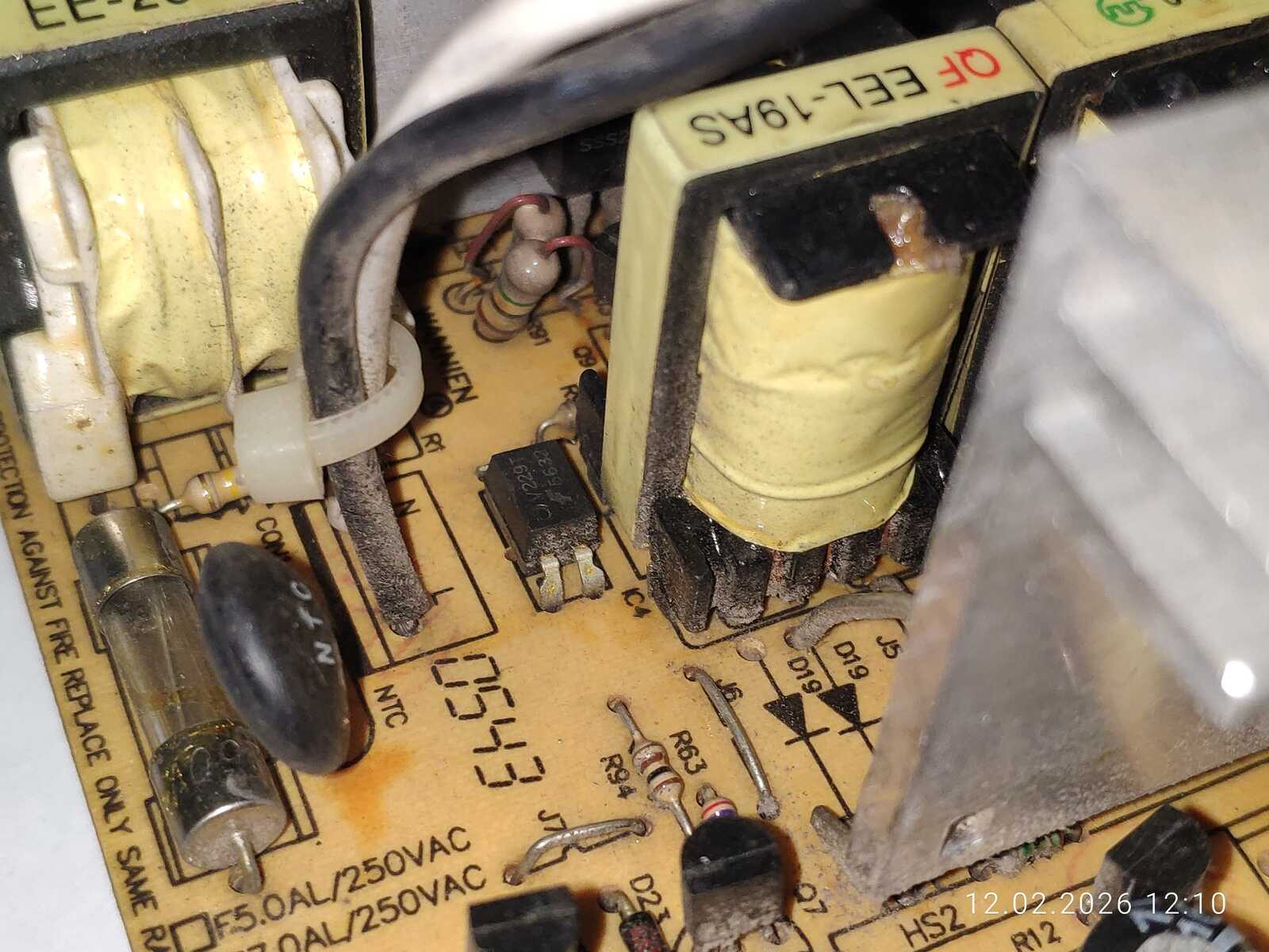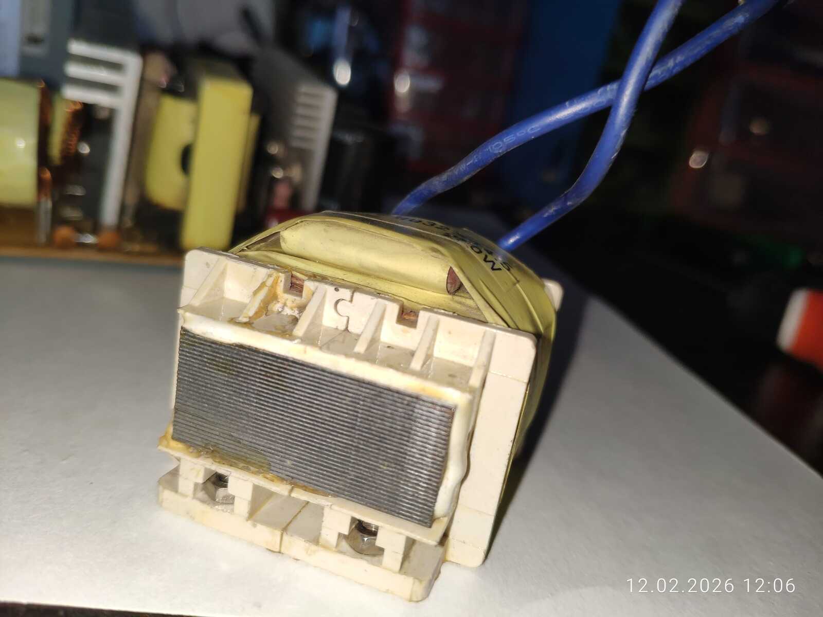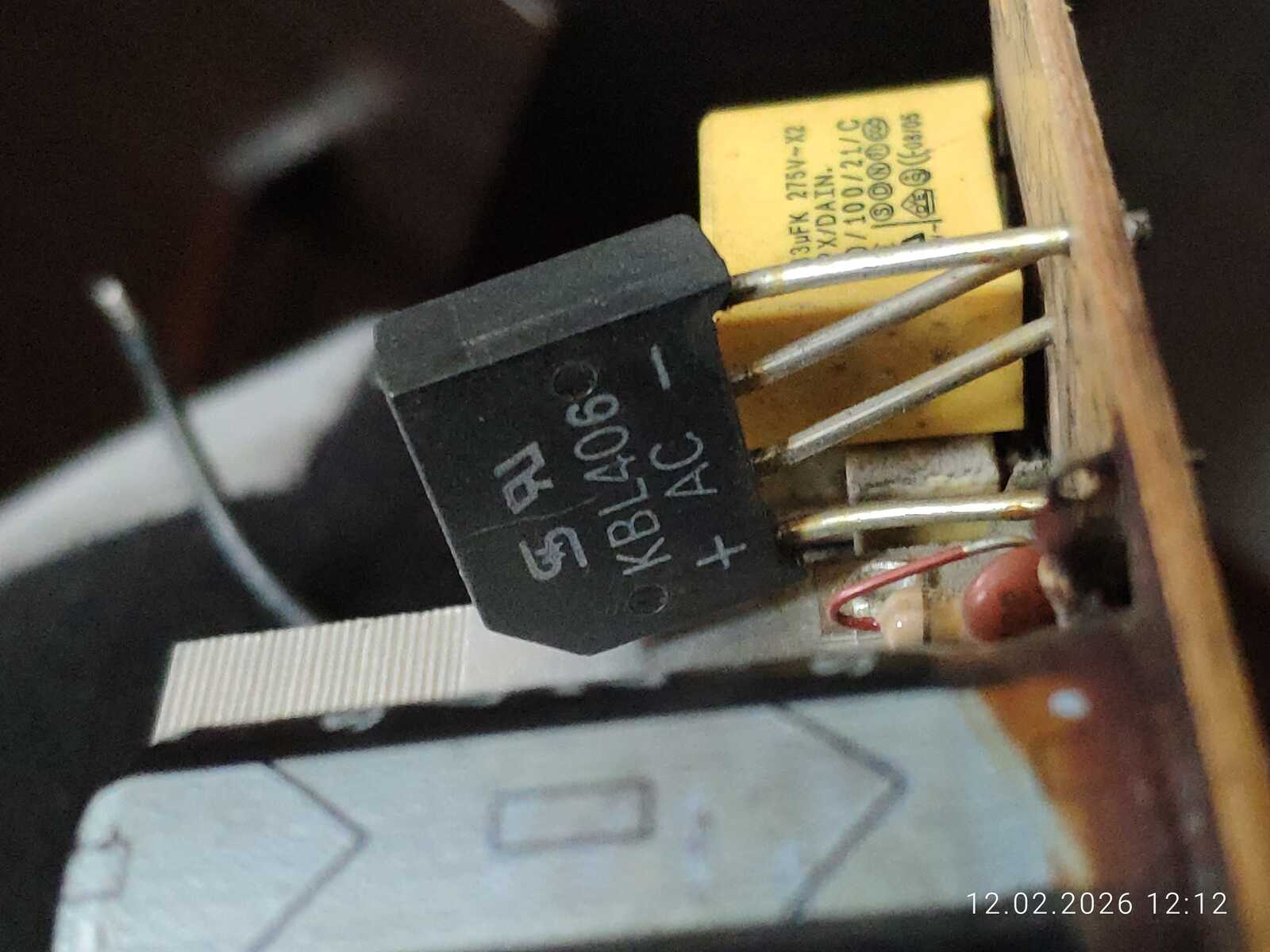 Заменил только конденсатор на 2200 мкФ более ёмким. Всё же выглядит он уже не очень хорошо, будто подгорел. Хотя это просто заводской клей испортился за двадцать лет.