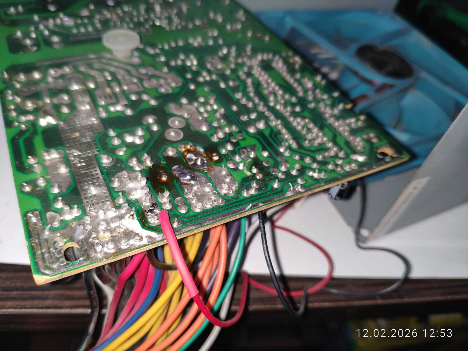 Конструкция блока питания почти полноценная. Всего несколько высоковольтных конденсаторов не припаяли. Так же видим дроссель PFC. Очень много места пустует. Однако не напрасно, ведь оно позволяет блоку питания лучше проветриваться. И да, выходные конденсаторы тоже обмазаны коричневым трухлявым клеем.