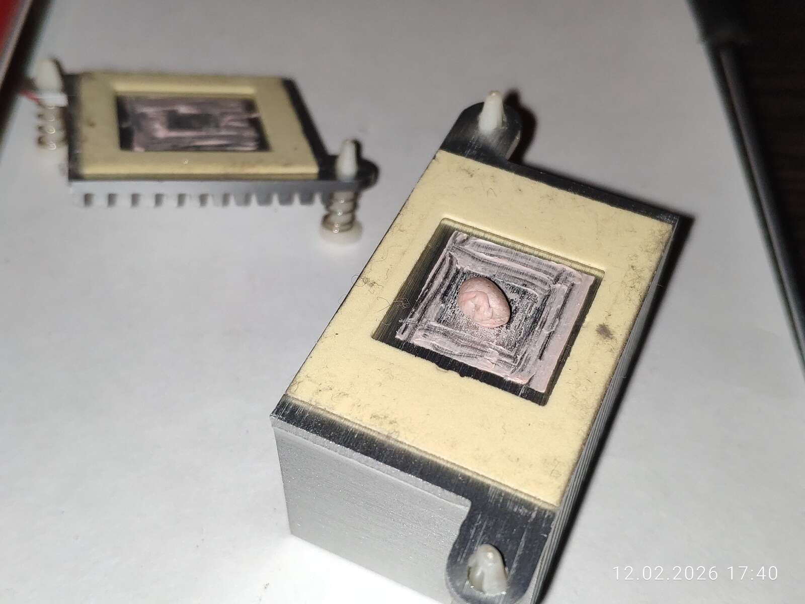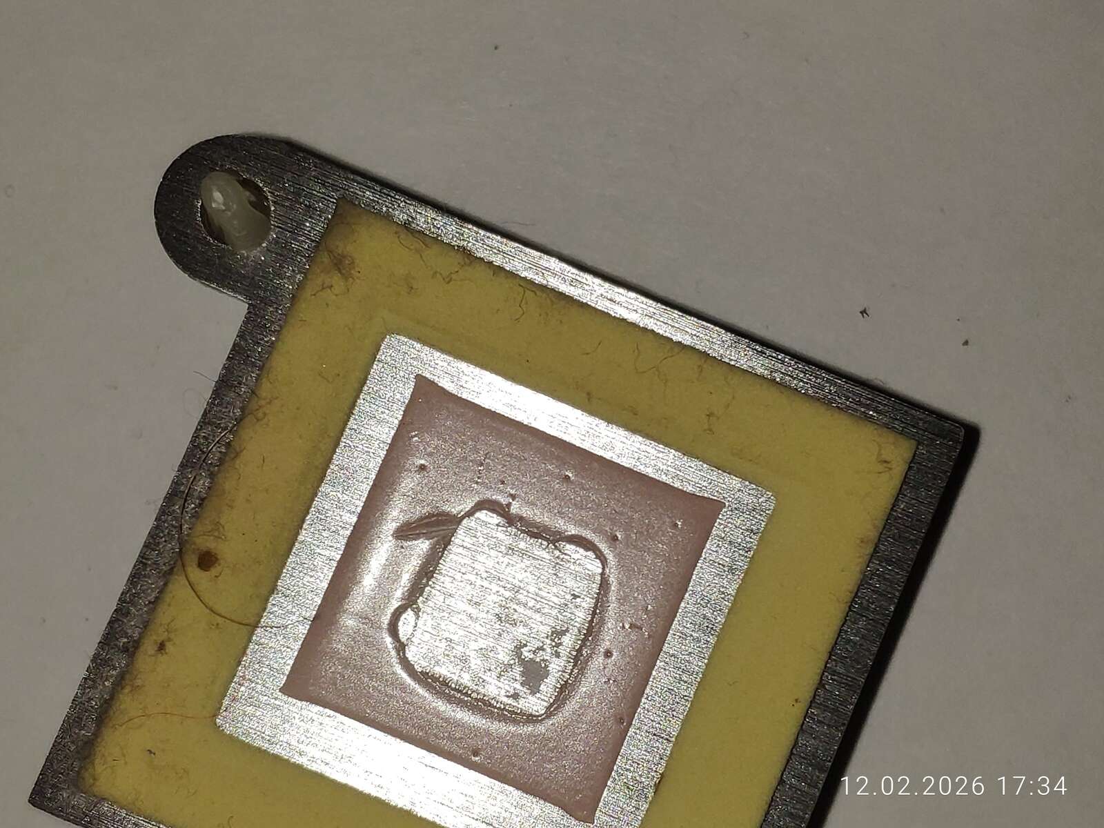 Плоскость герметика находиться ровно в плоскости кристалла, и это прекрасно. Но мы снова накроем герметик радиатором. Пусть ещё полежит, чтобы схватился окончательно и ничего не выступало.