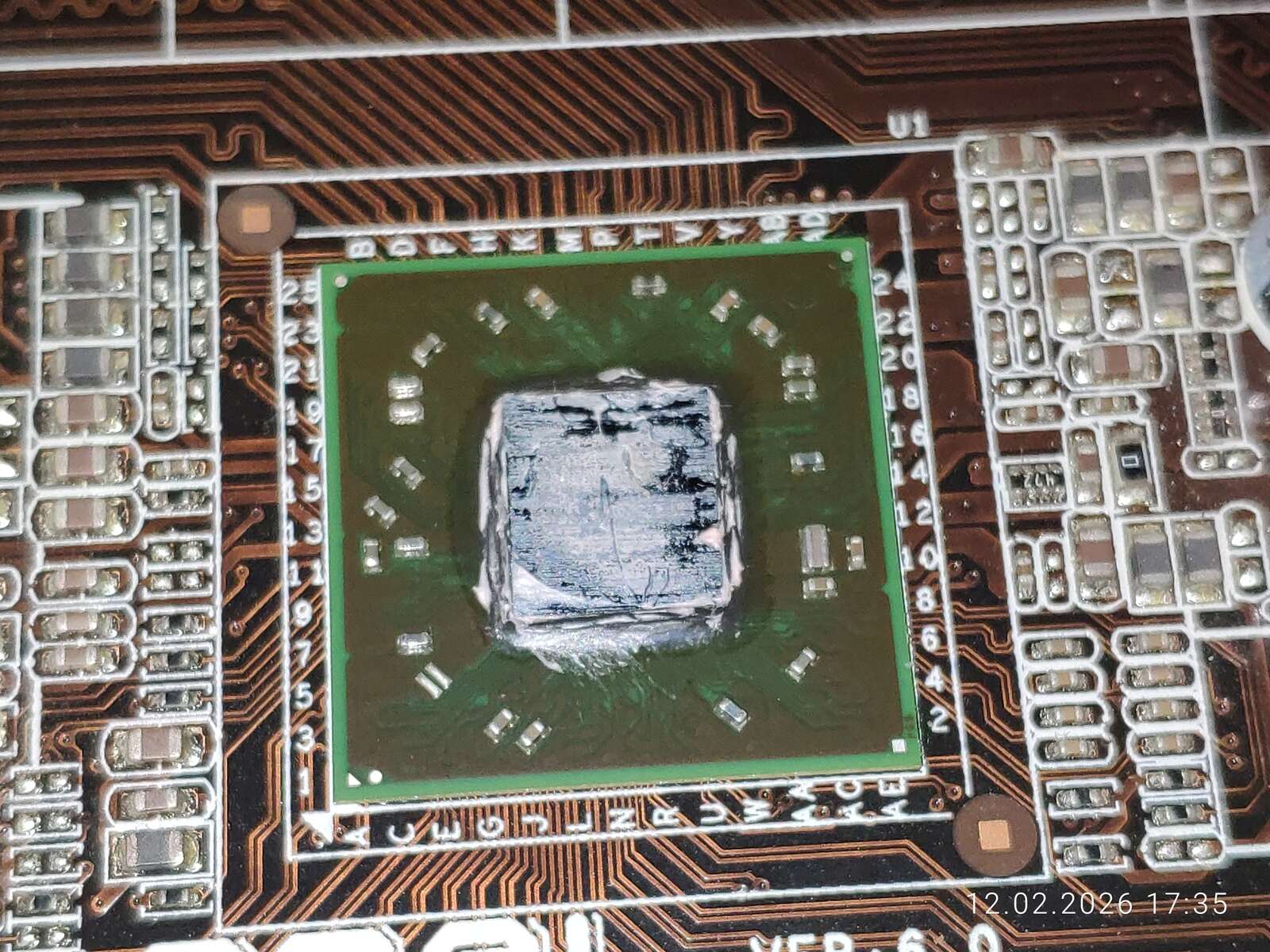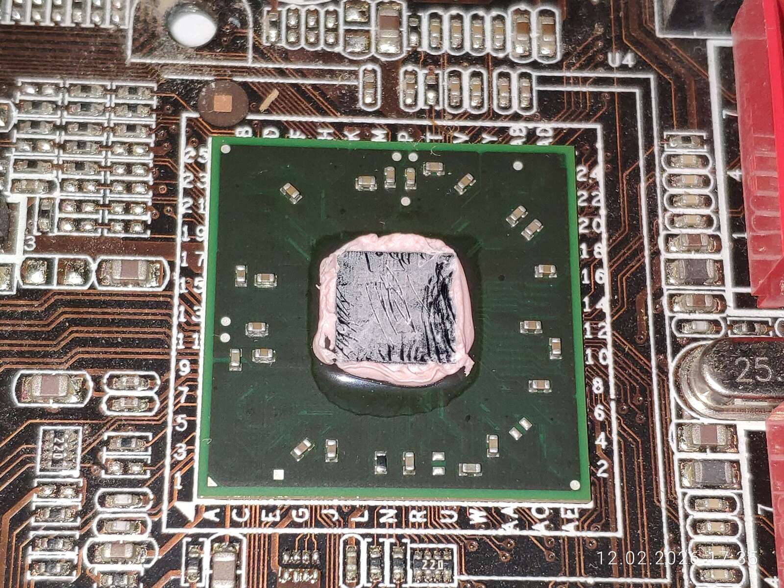 Также снимаю радиаторы с серверного и южного моста. Они приклеились на пластичную жвачку, теплопроводность которой вызывает большие сомнения, если прикоснуться. Обычно, если прокладки имеют хорошую теплопроводность, это хорошо чувствуется по скорости изменения температуры на пальце.