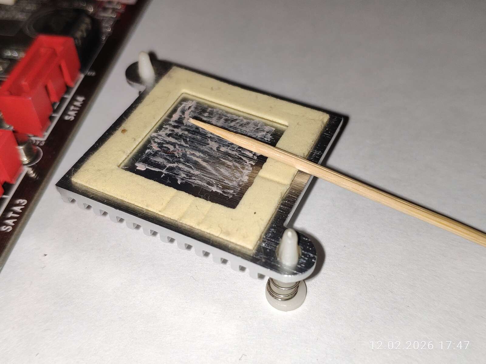 При беглом осмотре ничего подозрительного не было обнаружено. Разве только рамка вокруг сокета ремонтировалась для крепления системы охлаждения.