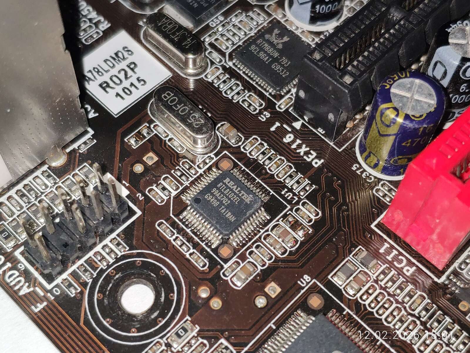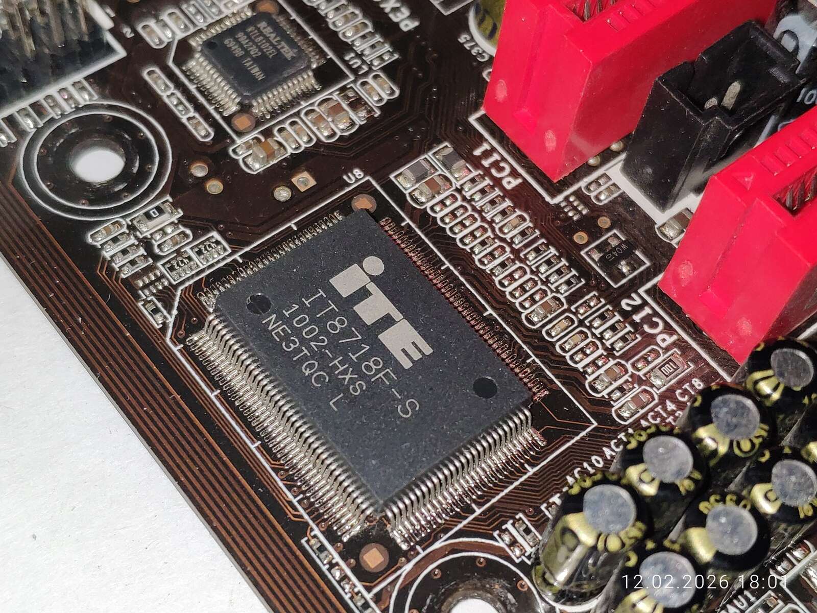 Микросхема BIOS 25L8005PC-15G съёмная. Можно извлечь и перепрограммировать без лишних проблем. Правда, делать это незачем. На плате есть возможность отключить индикатор питания на передней панели. Весьма предусмотрительно для корпусов, у которых неразборная колодка подключения передней панели. За звук отвечает Realtek ALC662. Мультиконтроллер — iTE IT8718F-S. Realtek RTL8102EL заведует сетевым подключением. Ну а в качестве тактового генератора используется RTM880N-793.
