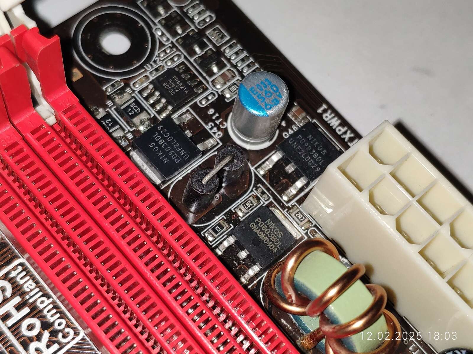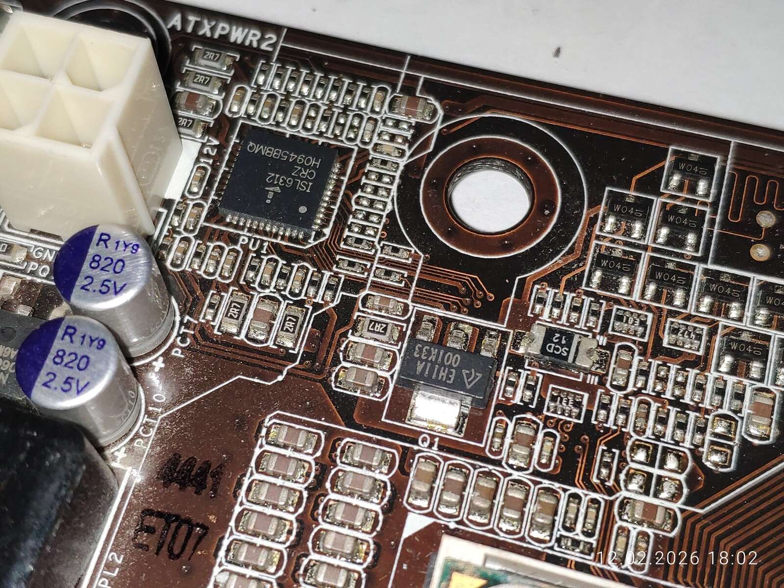 За питание процессора отвечают те же транзисторы P0903BDL и P0603BDL с максимальной силой тока до 250 и 300 Ампер в импульсном режиме. Управляет тремя фазами питания ISL6312. Из примечательного можно заметить диод Шоттки SCD12 рядом с линейным регулятором напряжения EH11A. Выглядит как предохранитель.