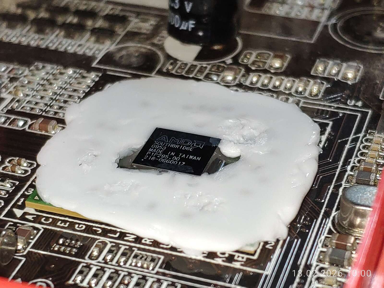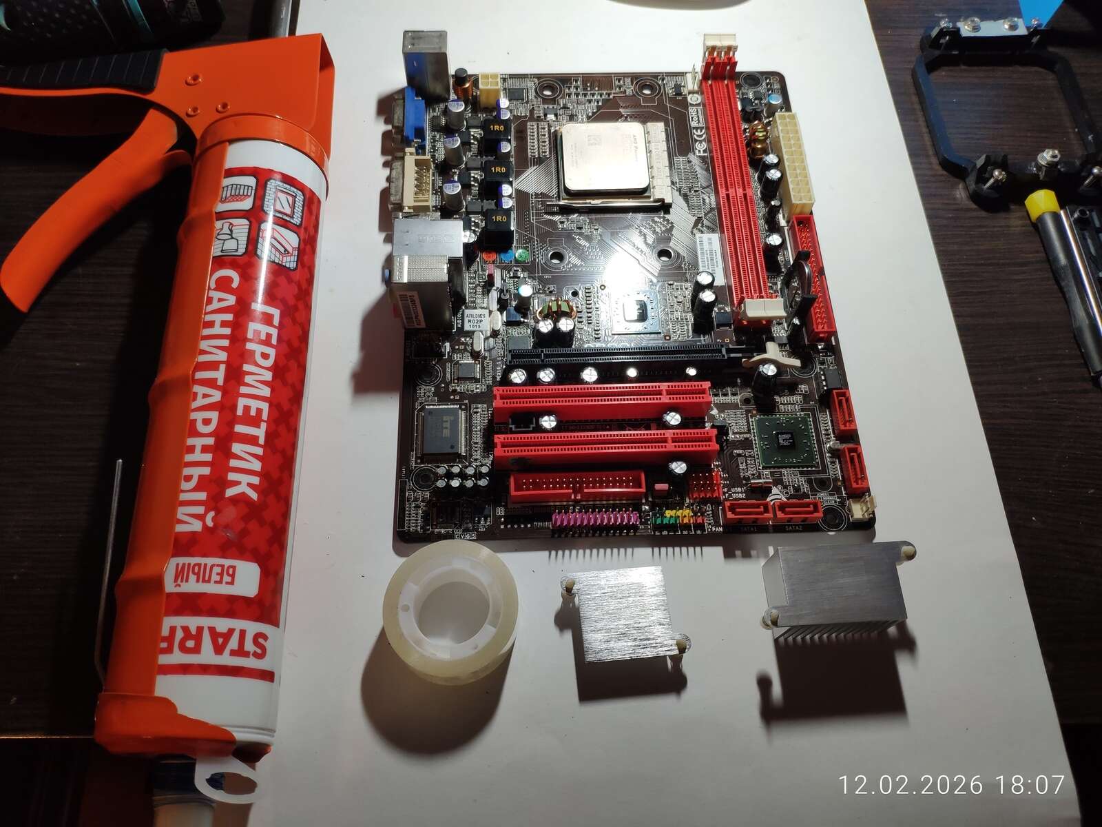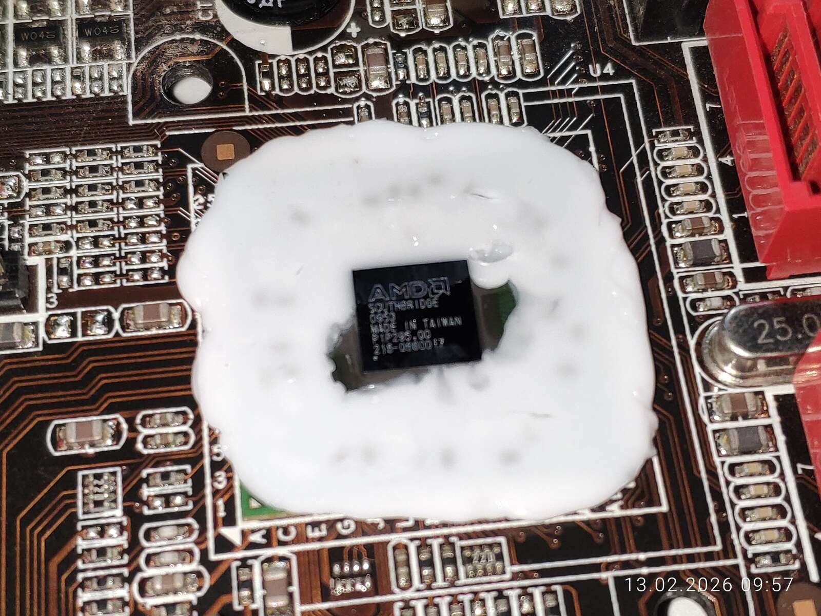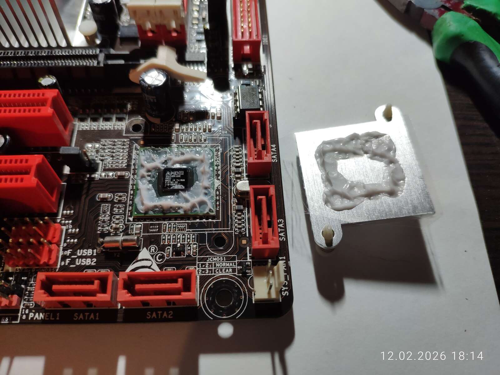 К сожалению, радиатор южного моста установился с сильным перекосом. Ну, не получилось равномерно прижать пластиковые крепления, и радиатор встал горбом, выдавив слишком много герметика. Так же радиатор мог сколоть кристалл в момент такого сильного перекоса, но не в этот раз, ведь на пятке радиатора приклеен мягкий скотч. Именно потому я и делаю такую защиту для кристаллов, что подобные радиаторы просто невозможно нормально установить без перекосов. Да и во время использования, можно ненароком надавить на край и это приведёт к перекосу, с вероятностью нанести повреждения кристаллу.
