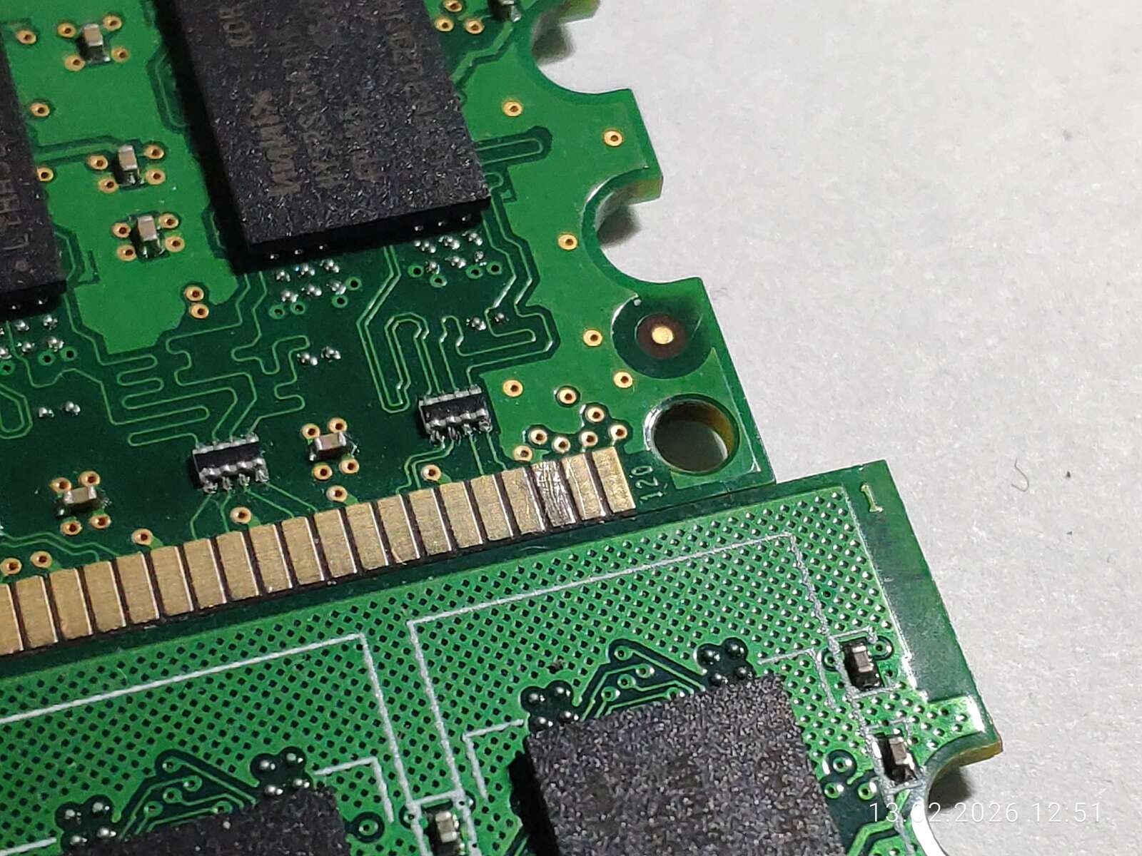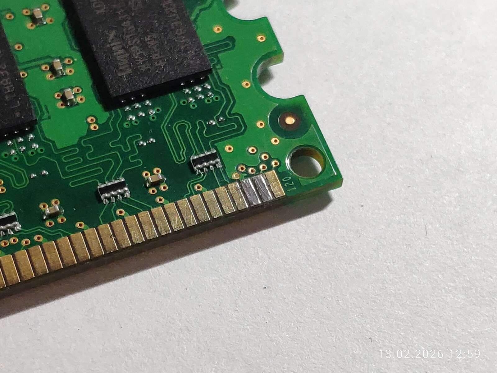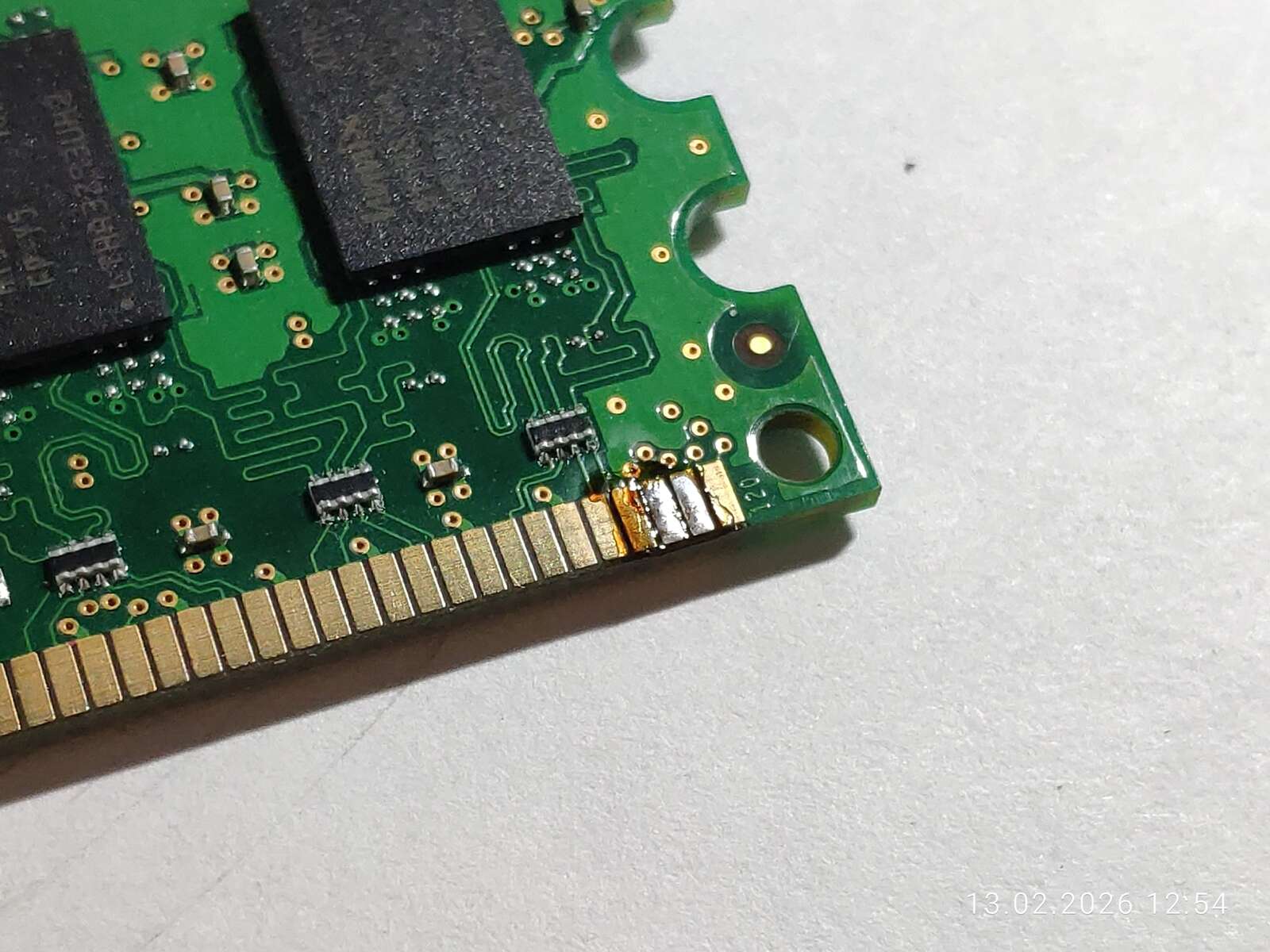 Модули на 2 гигабайта от Memory Power и Hynix. Модуль Hynix имеет одну повреждённую пятку. Изначально она была окисленной. Это вполне может повлиять на стабильность работы. Потому применяю проверенный метод восстановления с помощью припоя для пайки.