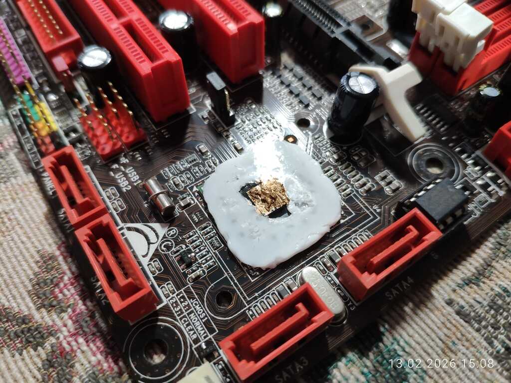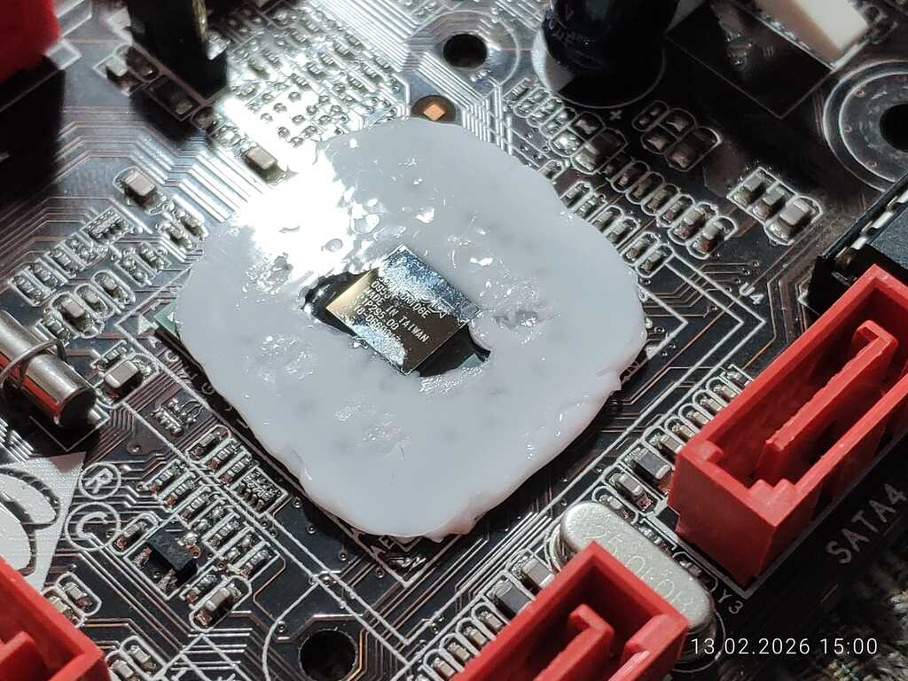 Некоторые, вероятно, не понимают, что происходит. Но я лишь воспользовался своим старым методом защиты кристаллов микросхем от сколов. Только намазал герметик прямо на подложку кристалла, без дополнительных слоёв.
