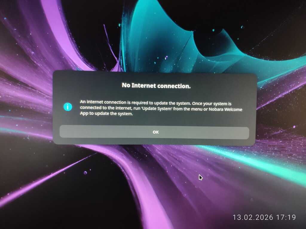 Но дальше будет веселее. Если в моём дистрибутиве Chimbalix, всё настроено и готово к использованию сразу после завершения установки операционной системы, то в других Линуксах всё по-прежнему печально. Запускаем дистрибутив Nobara и сразу же получаем нытье от системы обновлений про отсутствие доступа к интернету. Похоже, Nobara хочет скачать обновления без моего разрешения. За это я и недолюбливаю современные Линуксы, что они слишком много позволяют себе. Это же одна из причин, почему я создал свой дистрибутив Chimbalix, избавленный от потенциально вредоносных систем обновления.
