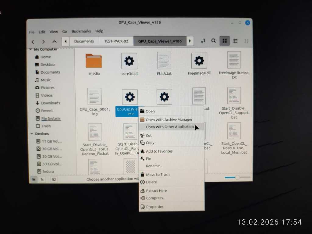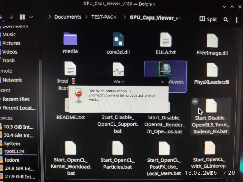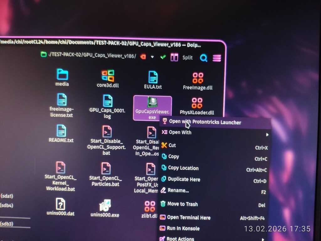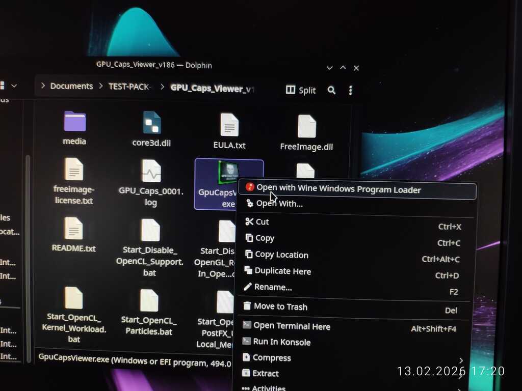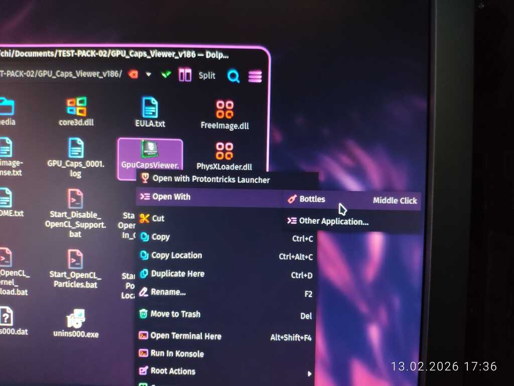 Дальше у нас игровой Линукс под названием Garuda. Тут тоже пришлось потанцевать с бубном. Сначала отключил настройку открытия файлов и папок одним кликом мыши (мне такое не нравится). Потом попытался запустить программу GPU Caps Viewer. Но игровая Garuda пыталась запускать через нерабочий Protontricks, а после, через такой же неисправный Bottles. Я уж подумал, что в этом игровом Линуксе нет даже простого WINE.