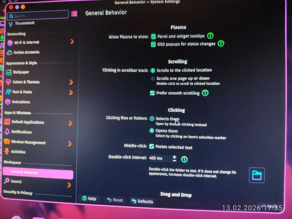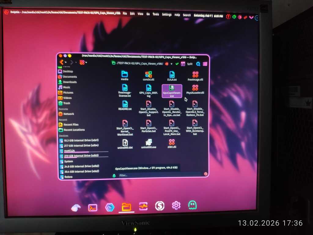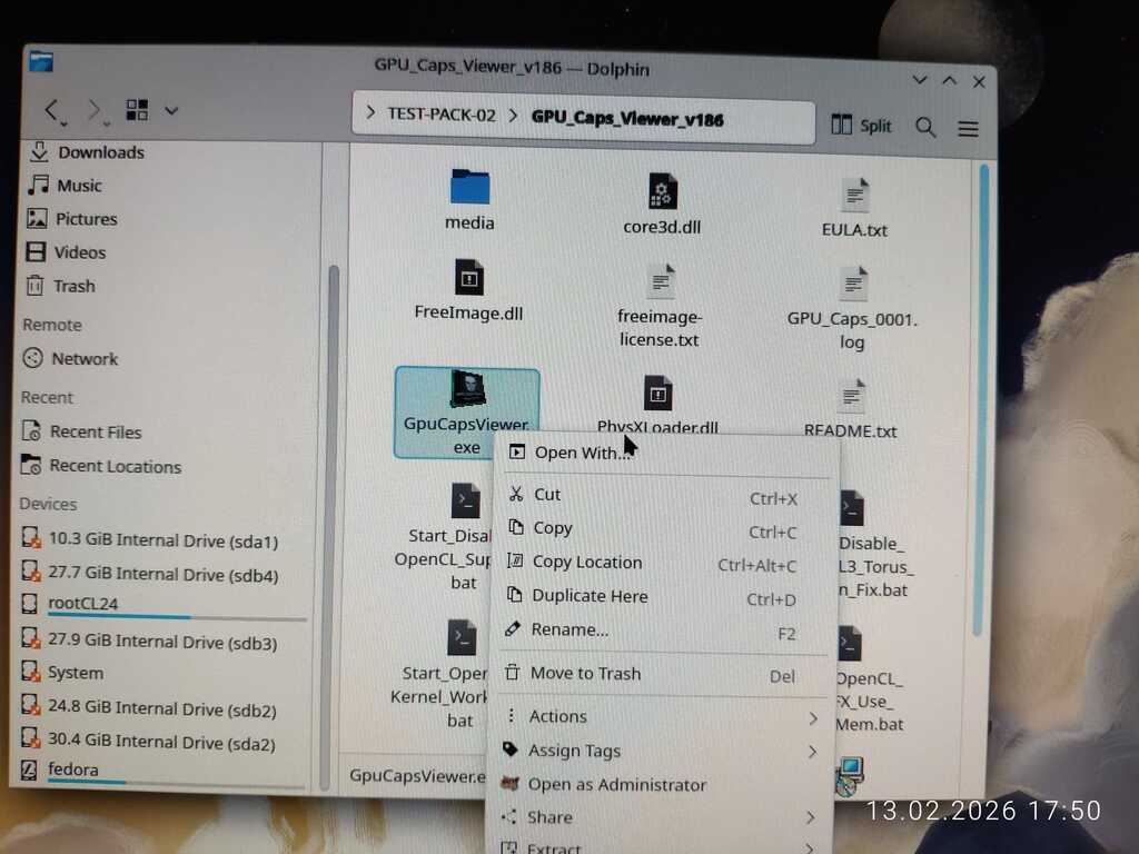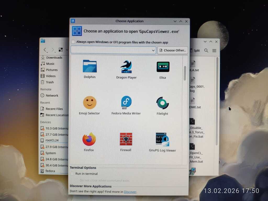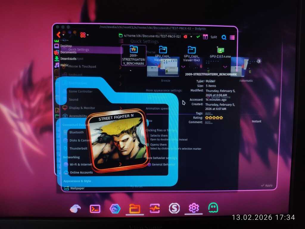 Дальше у нас игровой Линукс под названием Garuda. Тут тоже пришлось потанцевать с бубном. Сначала отключил настройку открытия файлов и папок одним кликом мыши (мне такое не нравится). Потом попытался запустить программу GPU Caps Viewer. Но игровая Garuda пыталась запускать через нерабочий Protontricks, а после, через такой же неисправный Bottles. Я уж подумал, что в этом игровом Линуксе нет даже простого WINE.