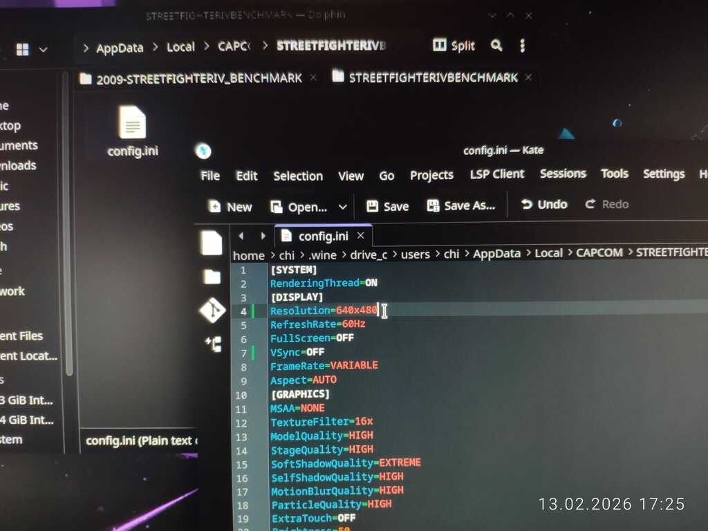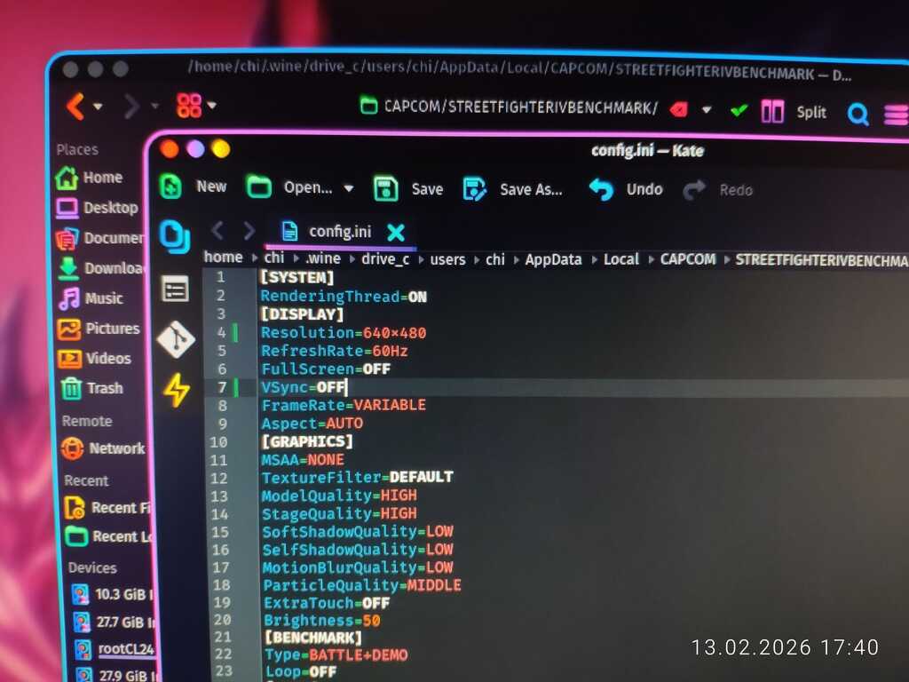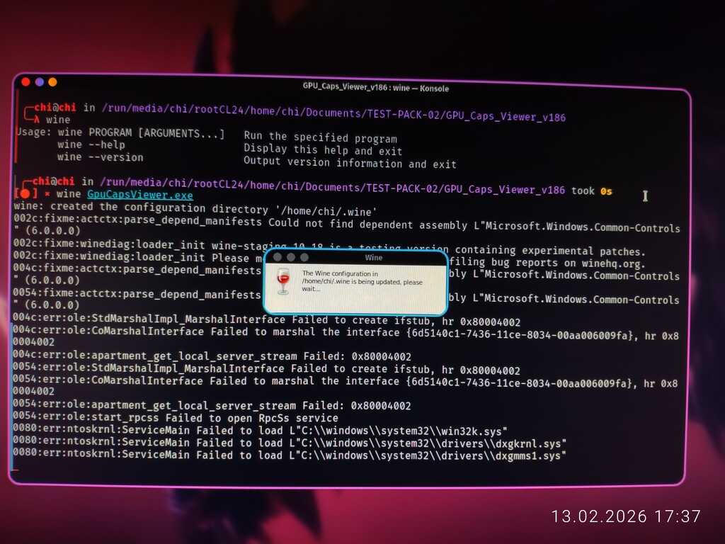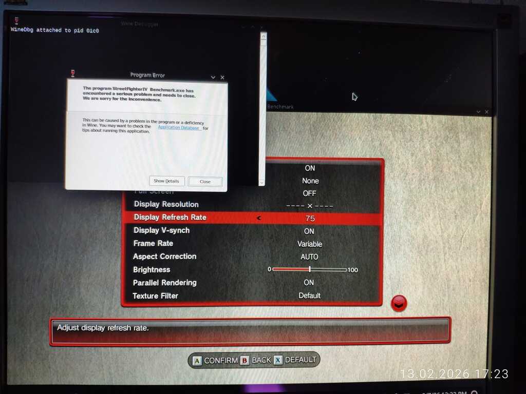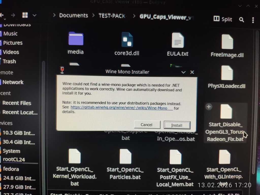 Пришлось изрядно потанцевать с бубном в игровом Линуксе Nobara, потому что встроенный в систему WINE просто упал при попытке изменить игровые настройки. Мне пришлось ковырять файл конфигурации, чтобы настроить игру. И даже так получил чуть меньше 8 fps. Ну а Radeon 3100 превратился в HD 2900 XT. И да, мы не установили Wine Mono, потому что это потребует доступа к Интернету. Программа просто зависнет в бесконечном ожидании доступа к репозиториям в Сети, если согласиться на установку Wine Mono.