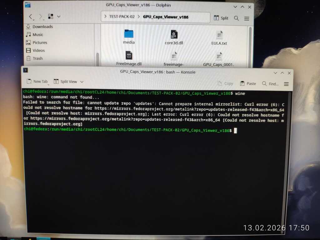 Линукс под названием Fedora провалился на этапе запуска программы. Linux без разрешения пользователя попытался выкачать обновления, когда ввёл команду wine в терминал и такой программы не нашлось.