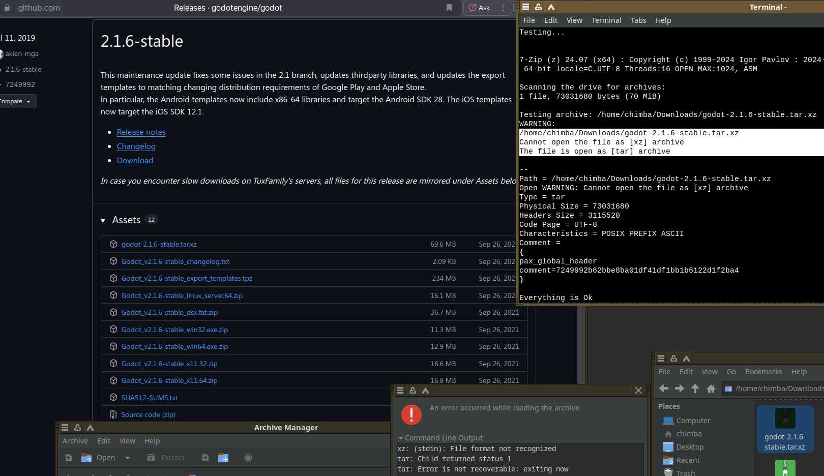 А ещё обнаружил, что в официальном репозитории Godot Engine распространяют кривой архив исходного кода Godot 2.1.6 Stable. Архив является простым TAR, когда по расширению это должен быть TAR/XZ. Но это так, забавный момент.