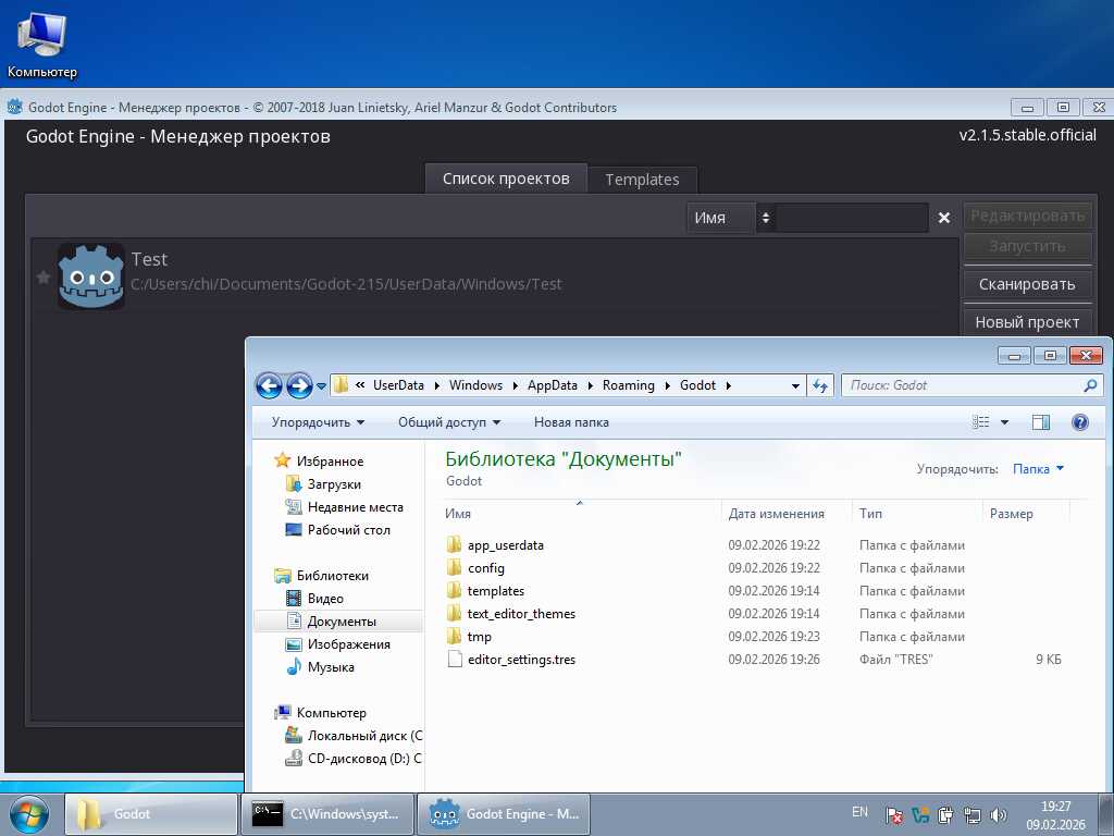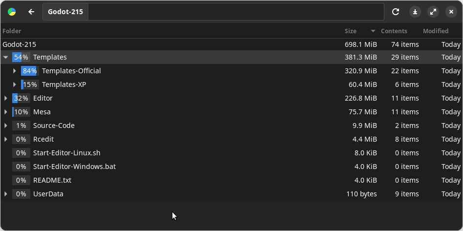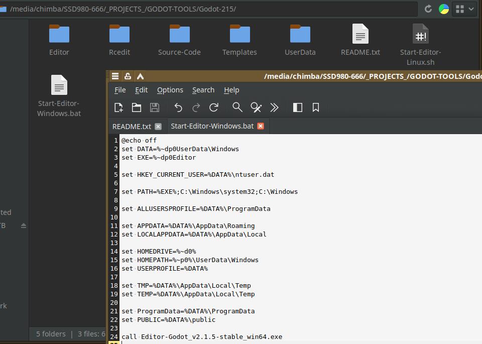Папка со средой разработки уже содержит несколько разных версий редактора Godot, вспомогательную утилиту Rcedit, шаблоны экспорта, исходный код и даже скрипты запуска с выносом домашнего каталога в папку UserData. Скрипты запуска основаны на лаунчере от Installer-SH.