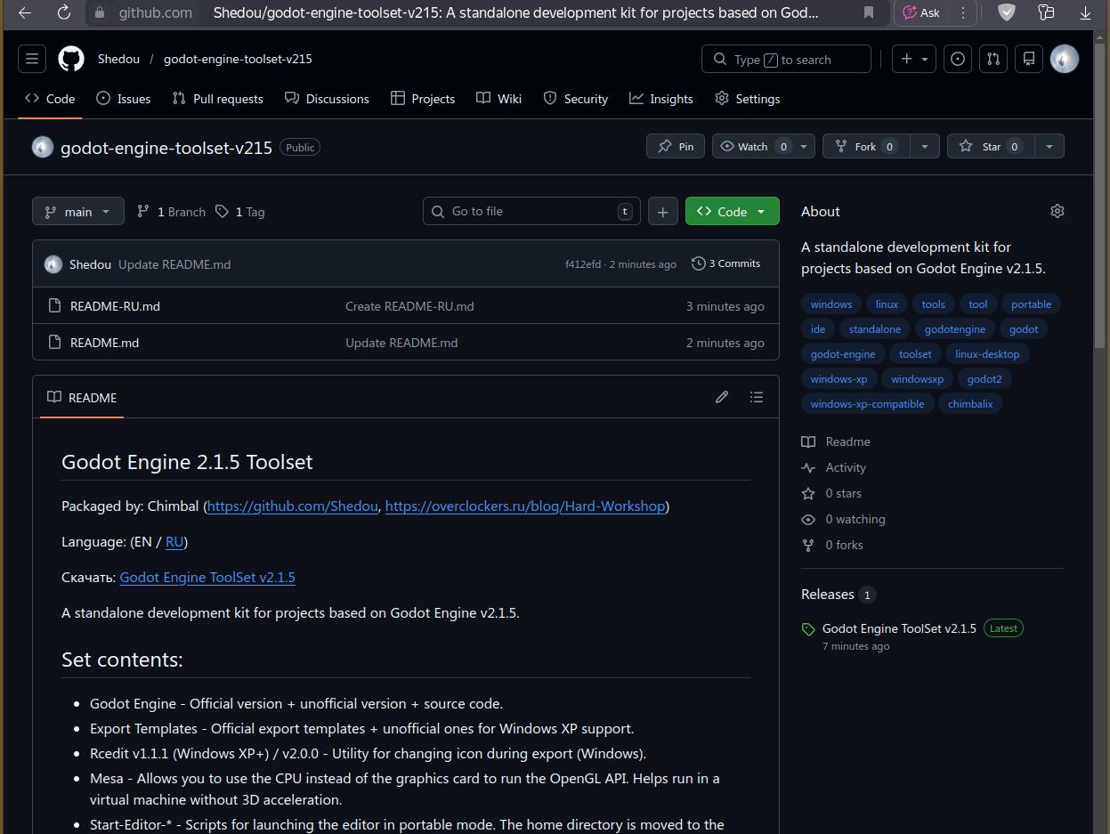 Дальше берём кастомный Godot Engine для Windows XP. Так как владелец репозитория оказался грамотным человеком, мы видим архивы не только с исходным кодом, но и скомпилированный вариант, готовый к использованию. Всё чётко и по делу. Моё уважение таким разработчикам.