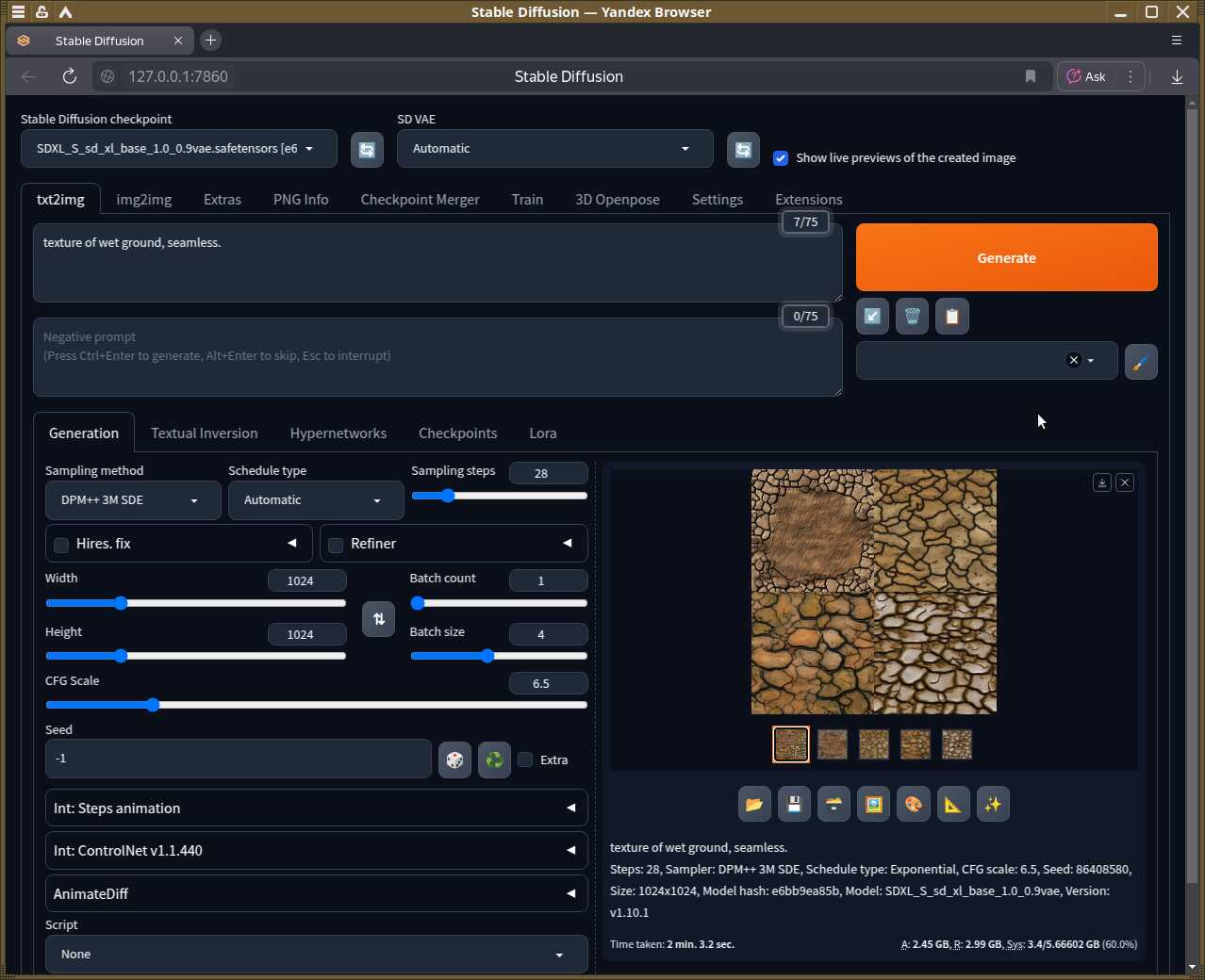 Пусть у меня и мобильная GeForce RTX 3060 всего на 6 гигабайт памяти, но этого более чем достаточно для генерации в разрешении до 1920x1200x4, то есть 4 изображения одновременно в разрешении 1920x1200. В среде Windows, конечно же, можно сгенерировать и в разрешении 3840x2160 при наличии 64 ГБ ОЗУ, ибо Windows гораздо лучше работает с памятью и драйверами видеокарт. Но я использую Linux вместо операционной системы, так что мои возможности немного ограничены.
