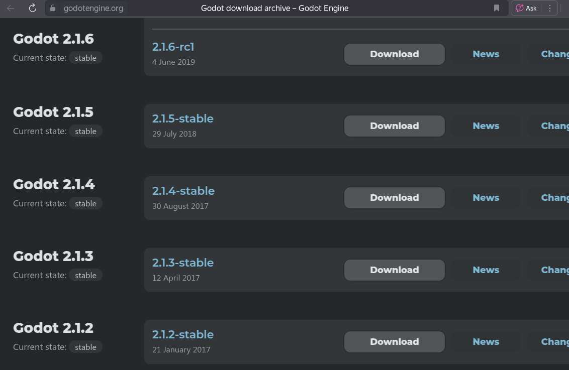 Сразу надо скачать оригинальный Godot версии 2.1.5. Можно взять и последнюю версию 2.1.6, но там довольно мало изменений относительно предыдущей версии. Так что не будем рисковать совместимостью лишний раз. И да, последние версии обхожу стороной из-за плохой обратной совместимости со старыми операционными системами. Но это и так знали читатели, знакомые с моими прошлыми статьями.