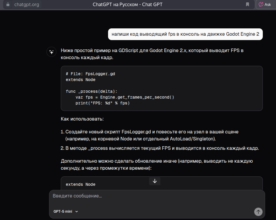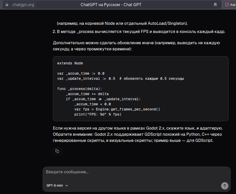 Да и нейронные сети не напишут код вместо меня, ибо зачастую и понятия не имеют про старый язык GDScript, используемый в старых версиях Godot Engine 2. Я уже пробовал запросить у нейронной сети простейший код для Godot Engine 2, но даже с этой задачей не справилась. Нейросеть с умным видом просто галлюцинировала. Как всегда.