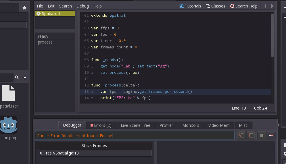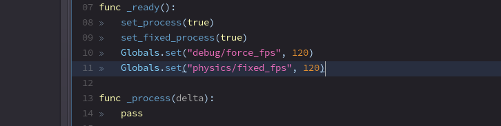 Куда сложнее управлять движком Godot. Мне нужна возможность гибко управлять частотой кадров, чтобы в главном меню не нагружать процессор и видеокарту лишней работой. Но с этим есть серьёзные проблемы у движка Godot. Globals просто не работает, как положено, а других функций и классов, способных изменить настройки движка, я пока не нашёл.