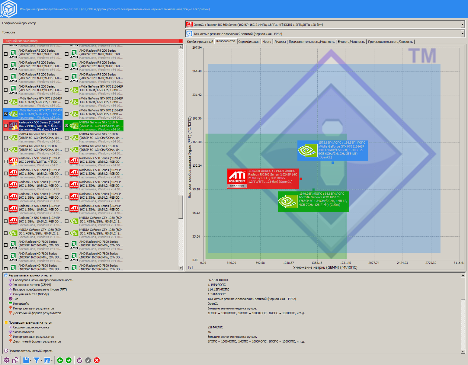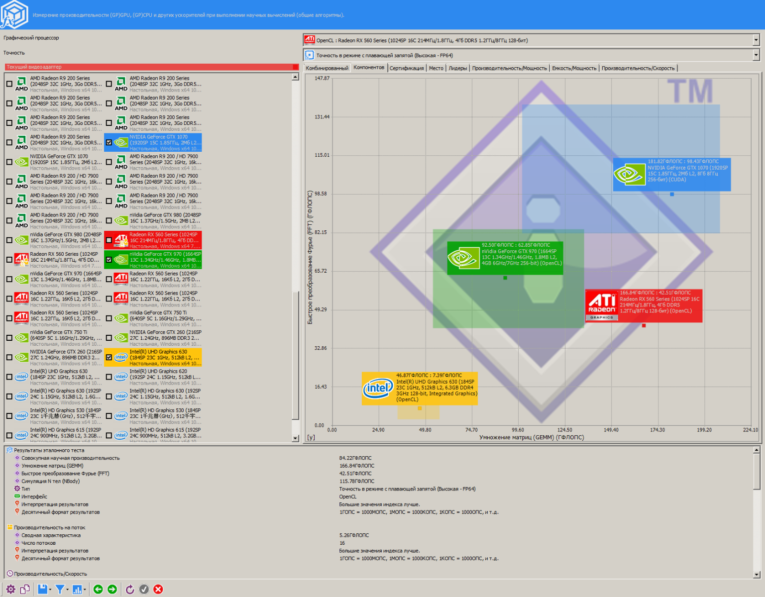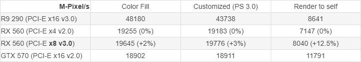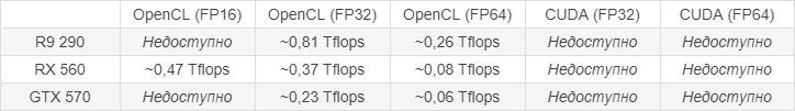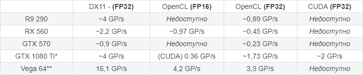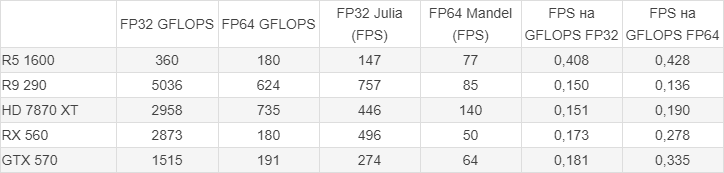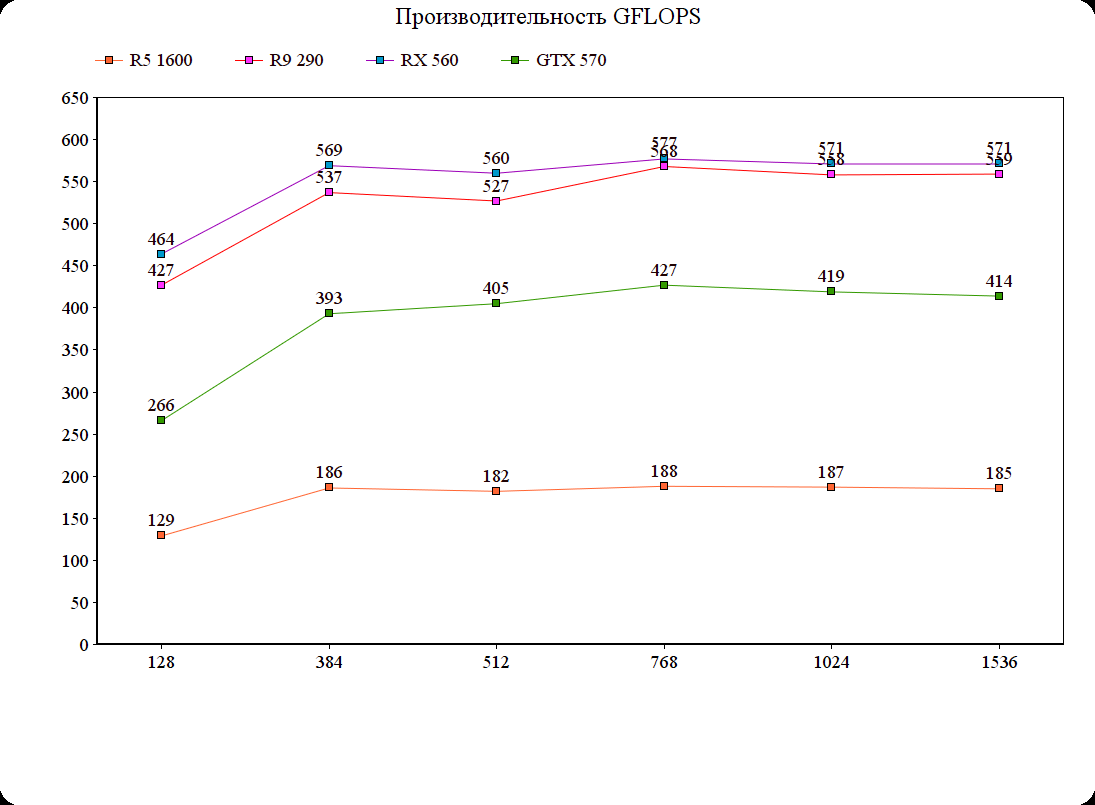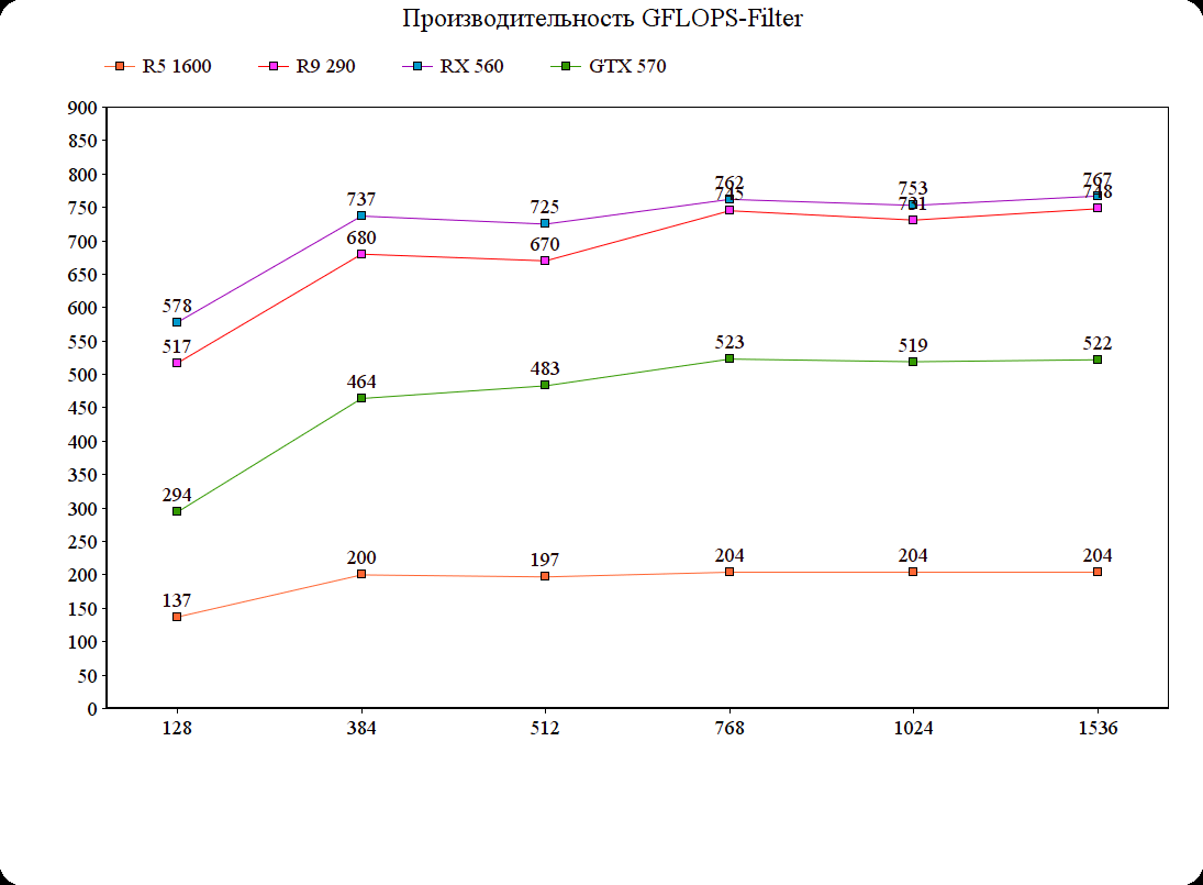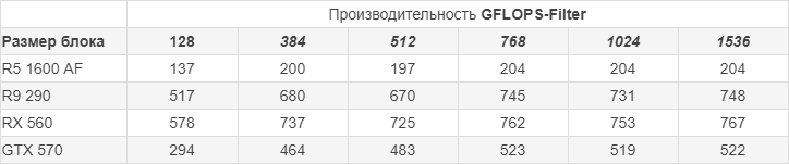 Как можно заметить, RX 560 эффективнее работает чем R9 290 с маленькими размерами блока, и в разгоне RX 560 даже быстрее оказалась чем R9 290, жаль лишь то, что у меня нет на руках видеокарты с чипом Tahiti, там результаты гораздо интереснее будут...