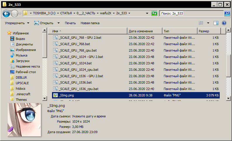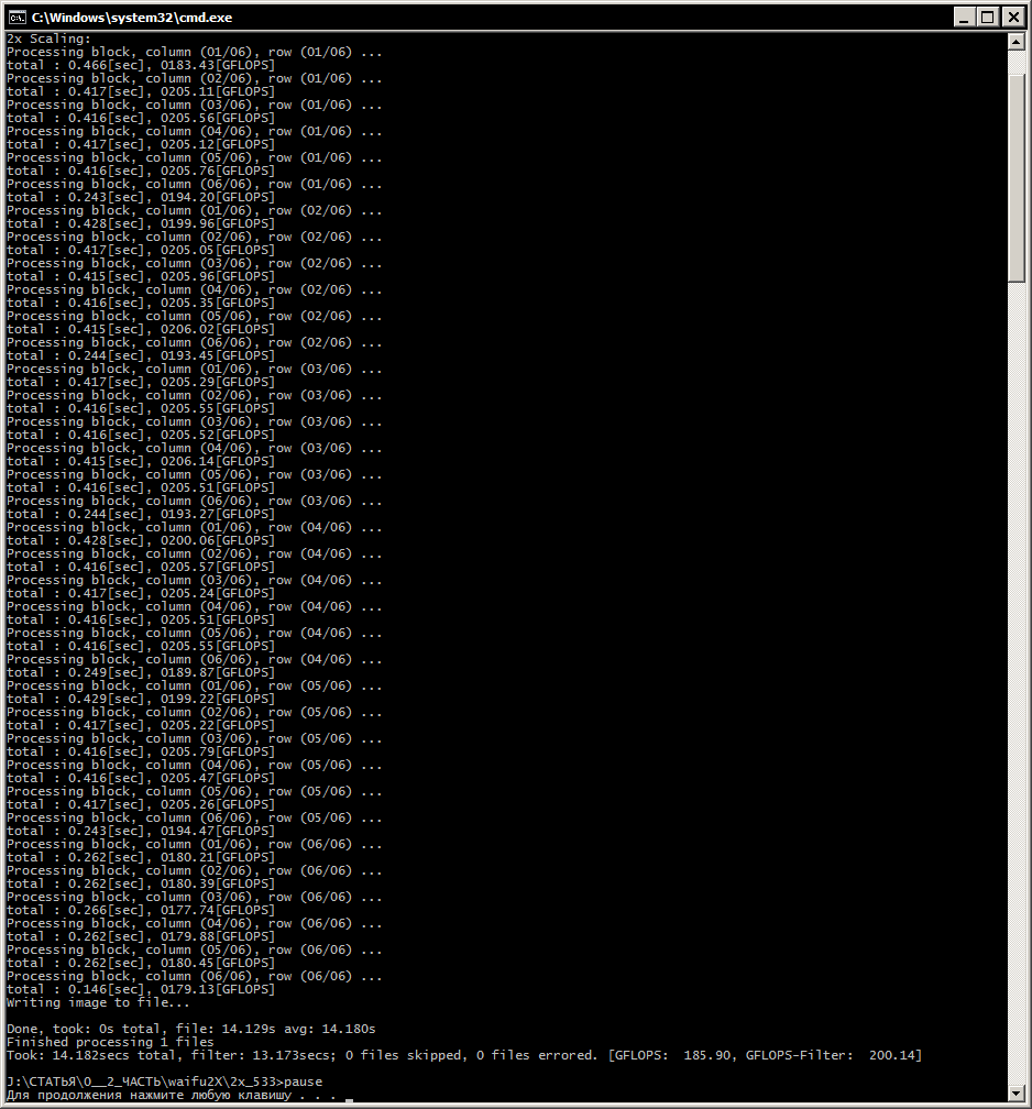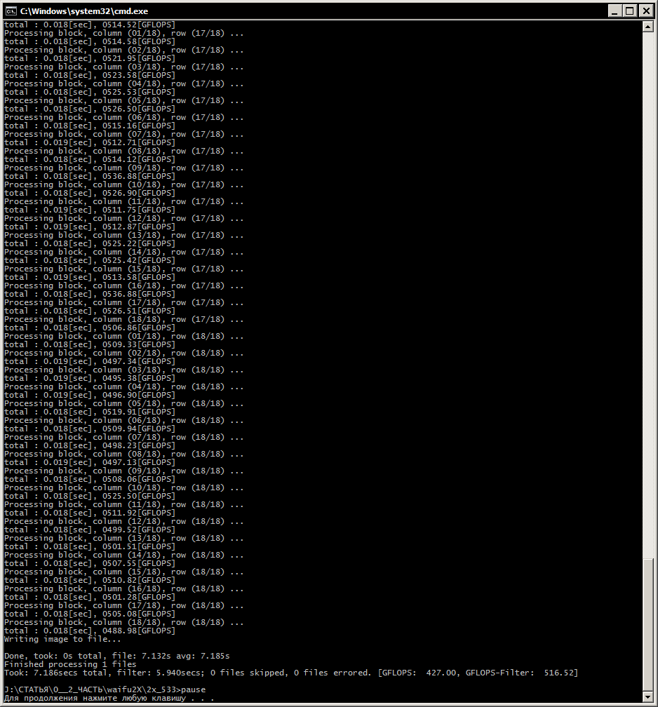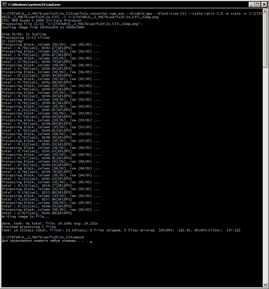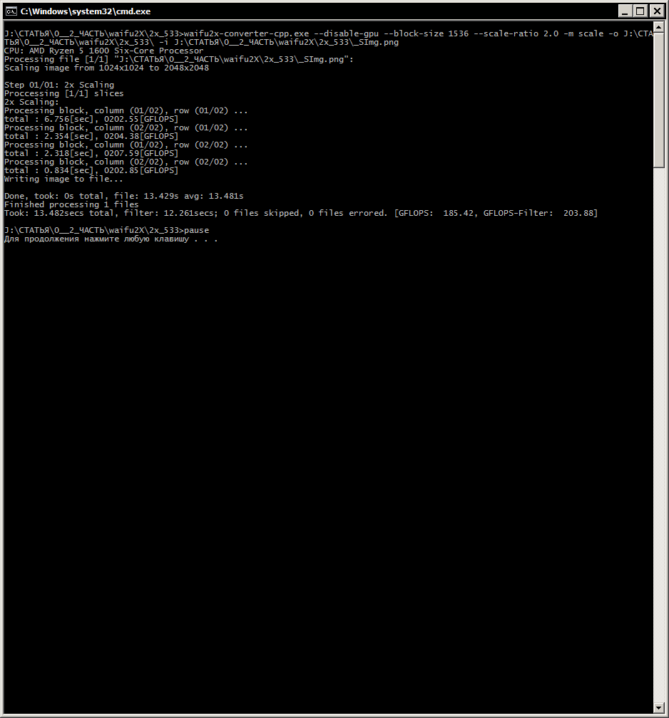 Для ЦП: waifu2x-converter-cpp.exe --disable-gpu --block-size 128 --scale-ratio 2.0 -m scale -o %~d1%~p1 -i %1 pause