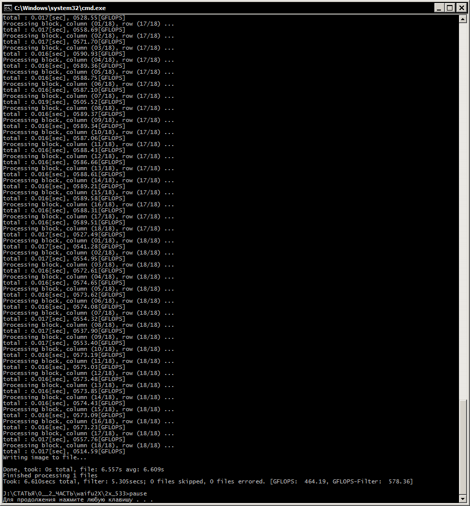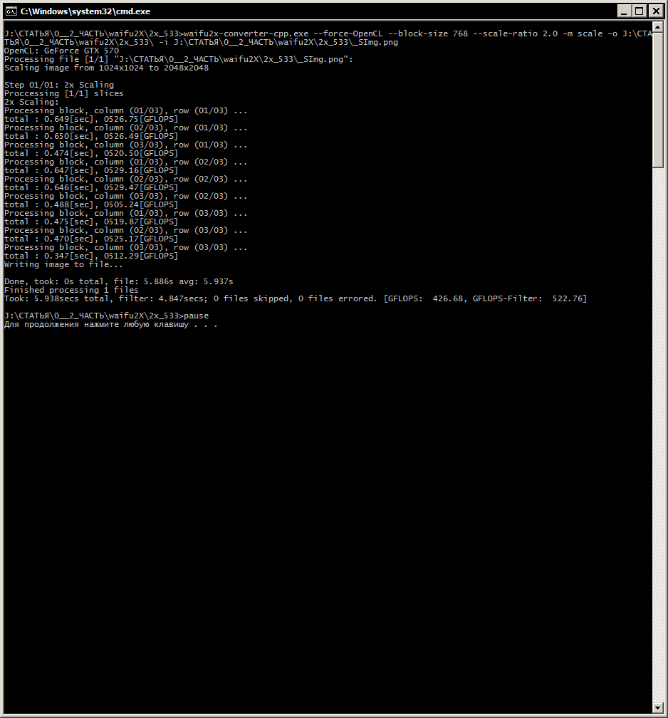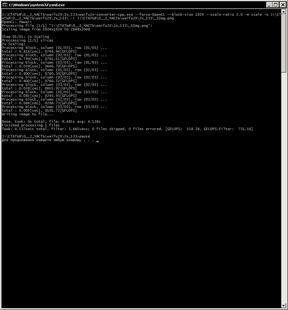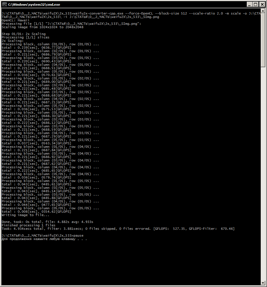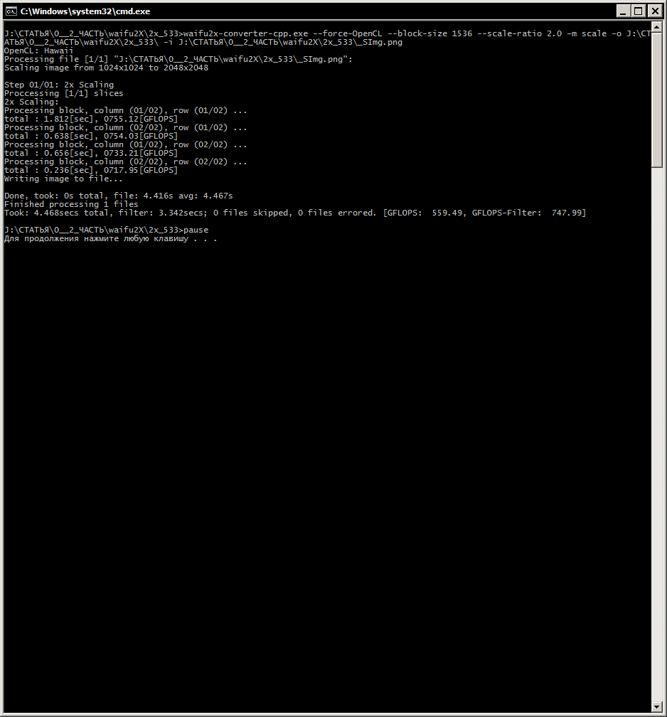 Для ГП 1: waifu2x-converter-cpp.exe --force-OpenCL --block-size 128 --scale-ratio 2.0 -m scale -o %~d1%~p1 -i %1 pause
