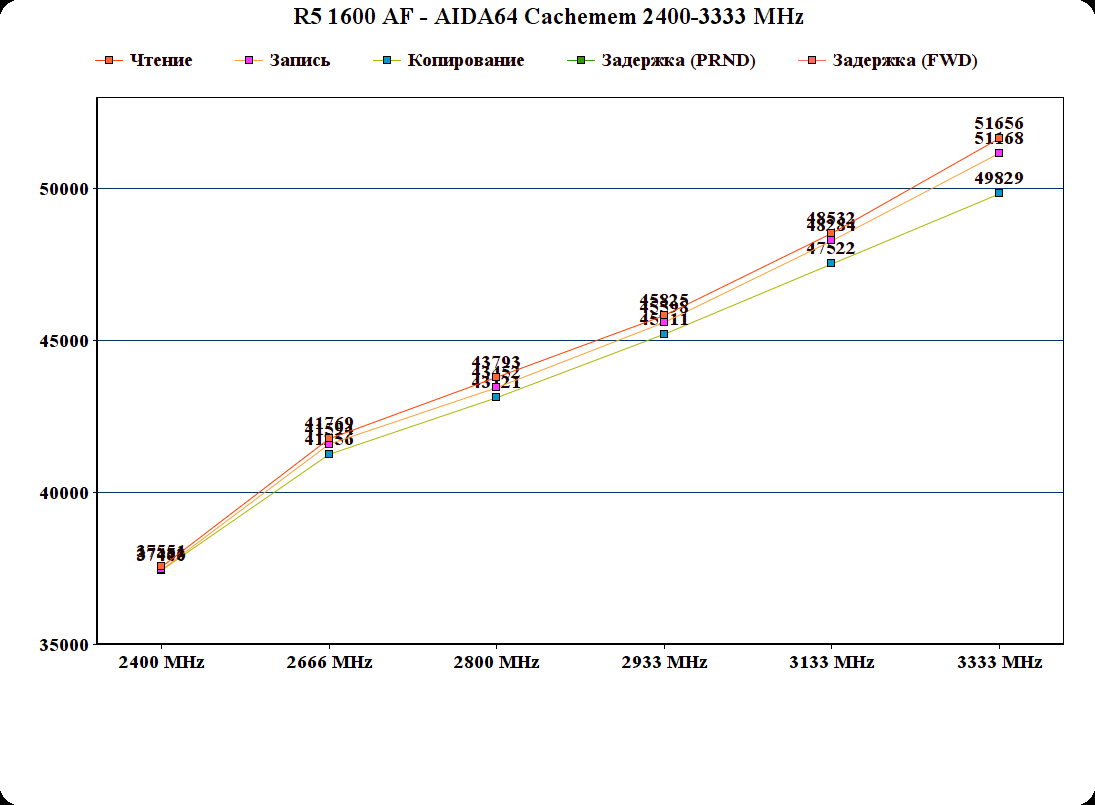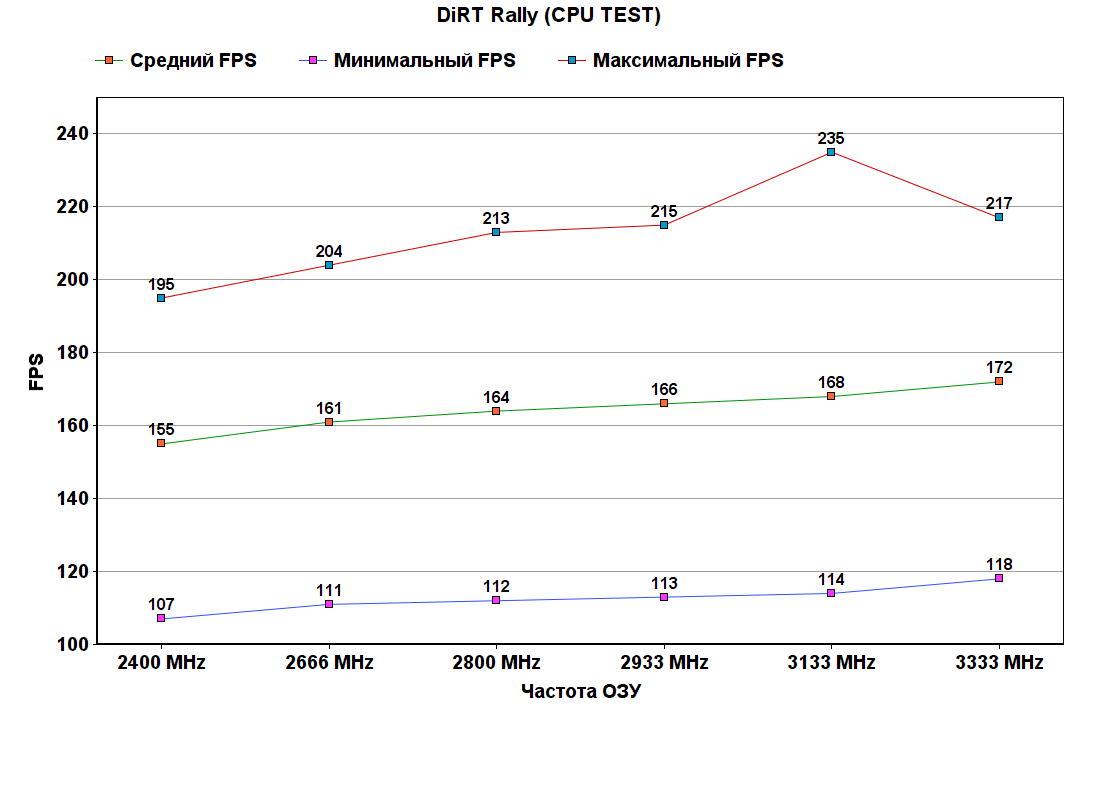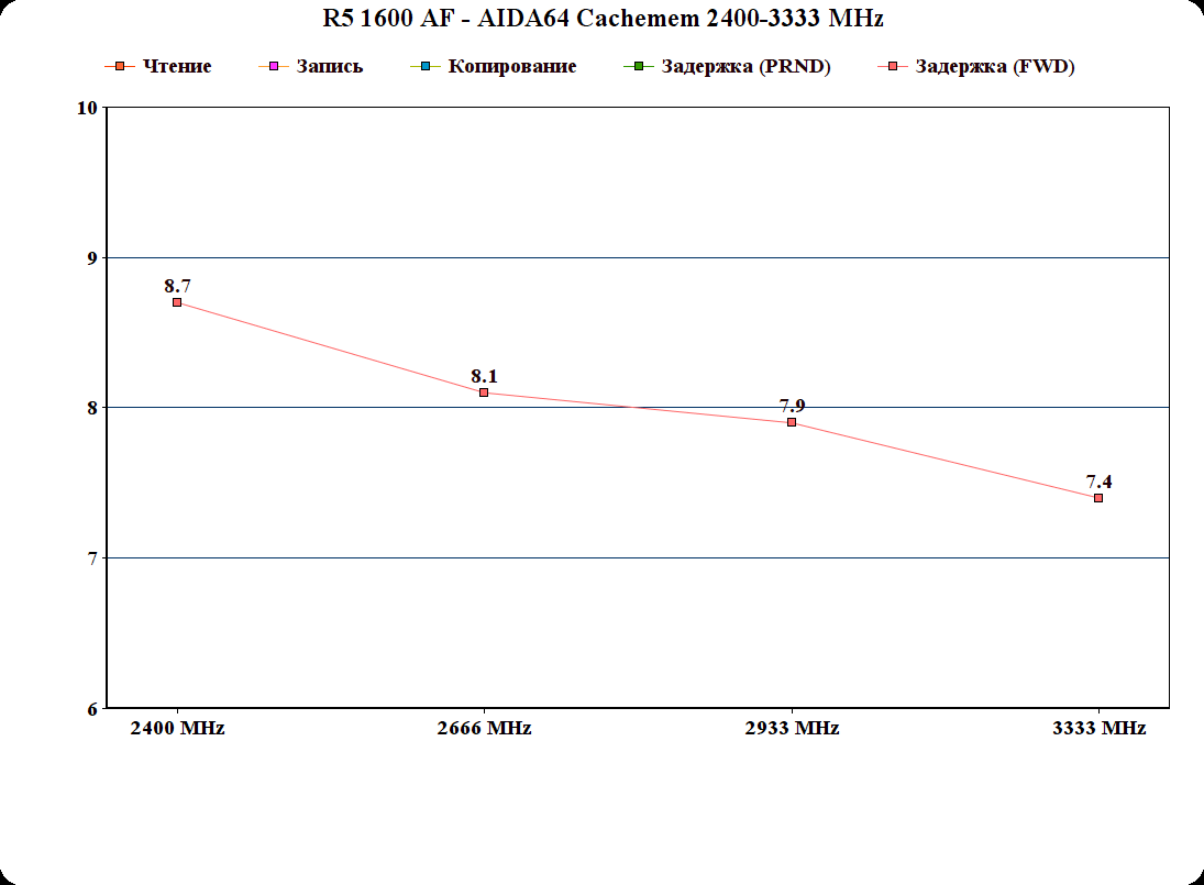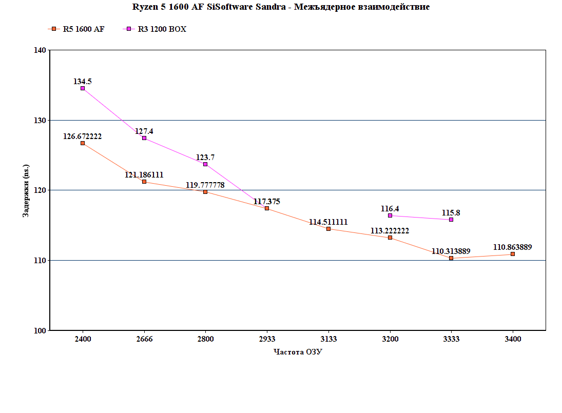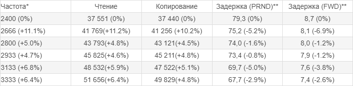 Причем если посмотреть на разницу между 2666 МГц и 2933 МГц, можно найти лишь ~2.5% снижение задержек доступа к ОЗУ, и тут снова образовалась "ступенька" как с 1200 райзеном, при переходе порога ОЗУ в 3000 МГц, однако между 3133 МГц и 3333 МГц разница уже не так значительна, как между 2933 МГц и 3133 МГц.