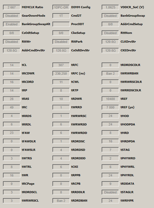 2666 MHz тайминги от 2133 MHz (533 MHz разница) CL-RCD-RP-RAS - 14-16-14-28 CR1