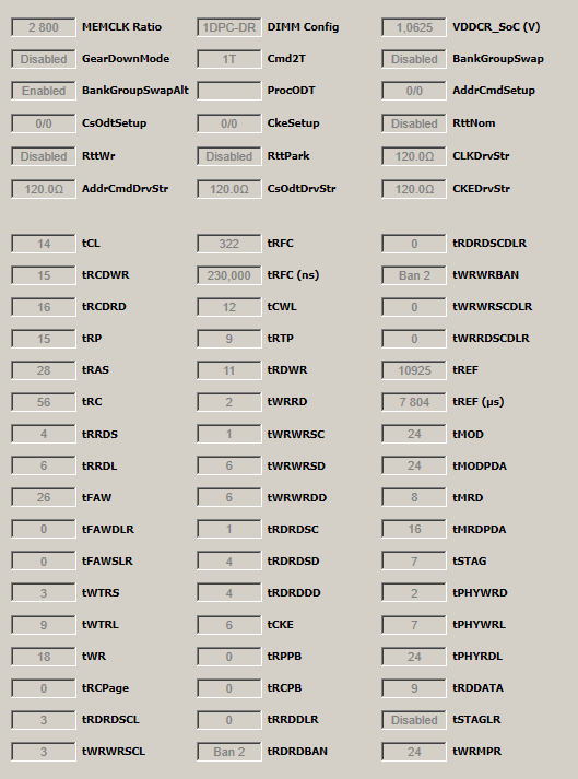 2800 MHz тайминги от 2400 MHz (400 MHz разница) CL-RCD-RP-RAS - 14-16-15-28 CR1