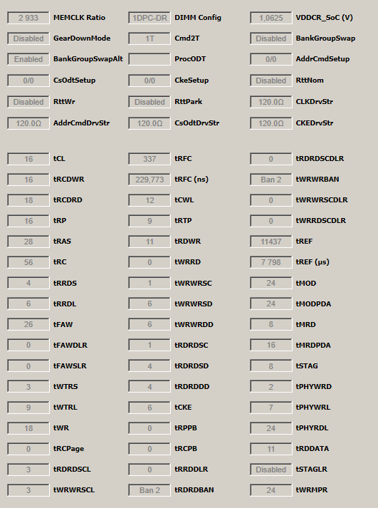 2933 MHz тайминги от 2400 MHz (533 MHz разница) CL-RCD-RP-RAS - 16-18-16-28 CR1
