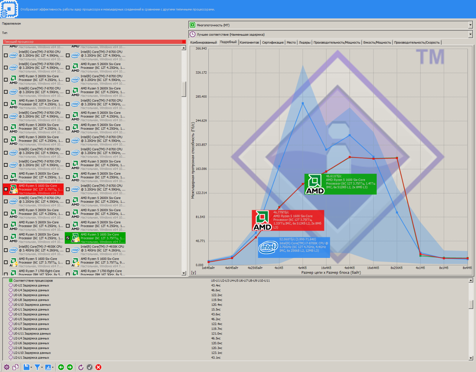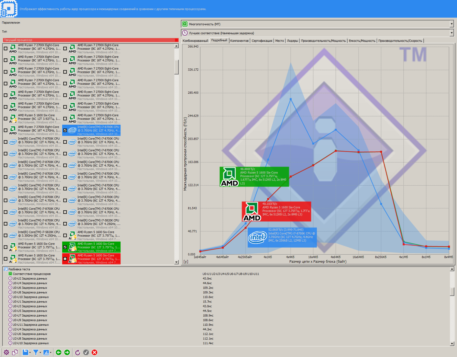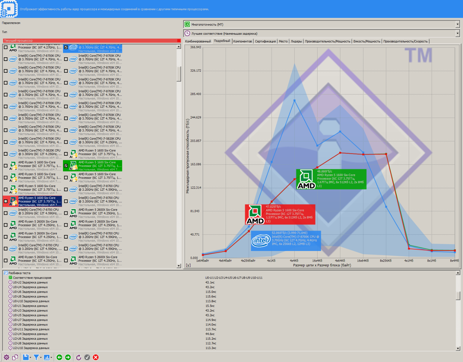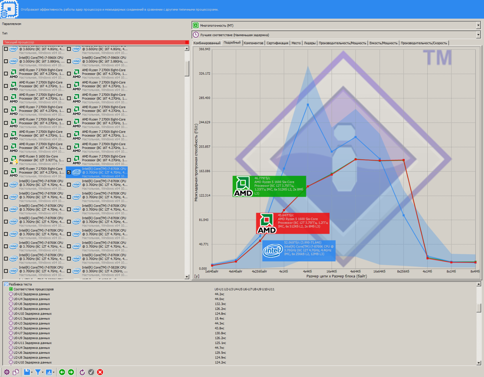 Забавная ситуация случилась с задержками между 2666 МГц и 2800 МГц, несмотря на практически одинаковые первичные тайминги, задержки не изменились значительно, несмотря на рост пропускной способности и частоты.