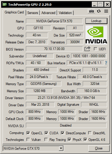 GTX 570: PCI-E x16 v2.0, 800 MHz GPU, 1000 MHz MEM.