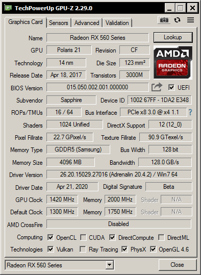 RX 560: PCI-E x4 v2.0, 1420 MHz GPU, 2000 MHz MEM, +75% Power Target, +0.09v GPU, +0.1v MEM