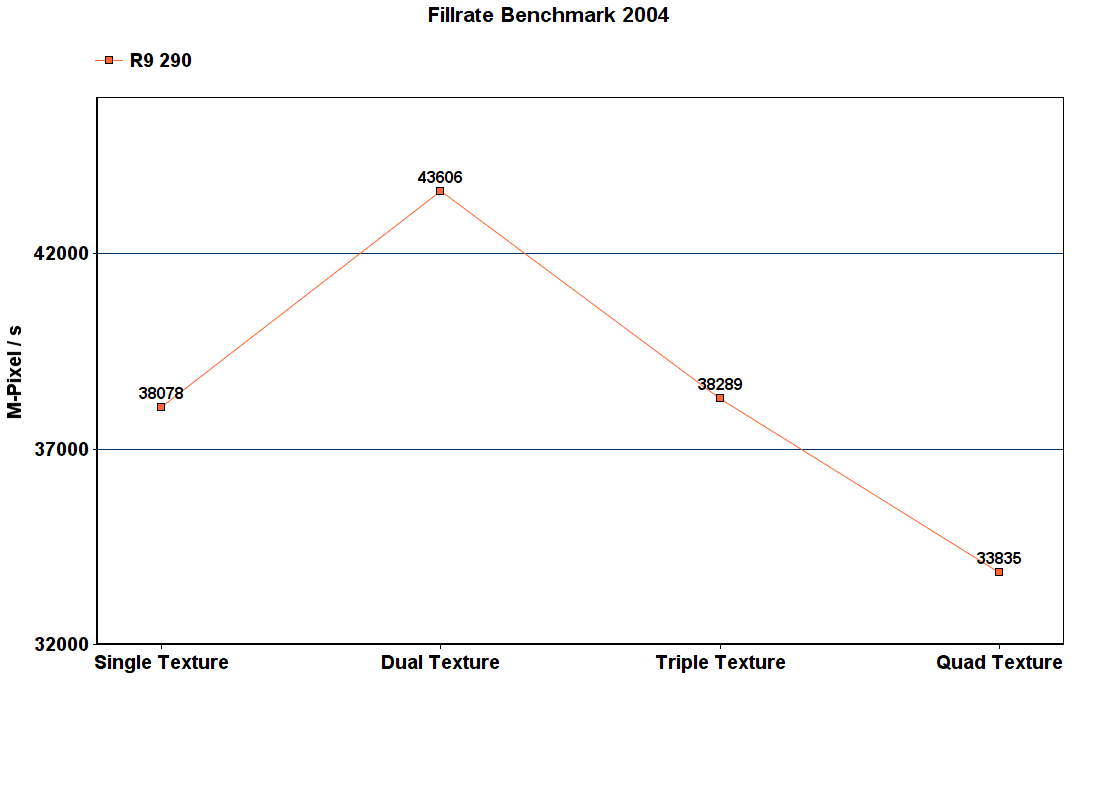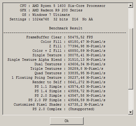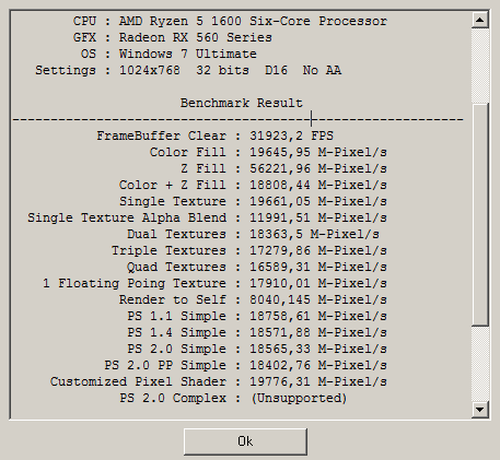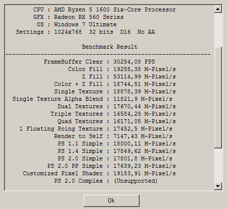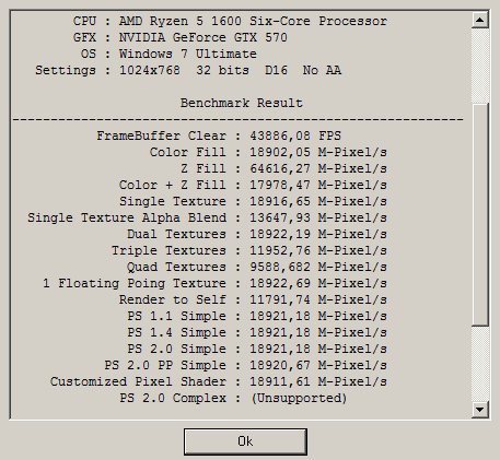 - Нужен для проверки тексельной скорости заполнения (TMU), 3D Mark Vantage способен определять и пиксельную скорость заполнения (Color Fillrate), однако у него есть нюанс неприятный, влияющий на результаты в меньшую сторону, потому я решил оставить FillrateBenchmark и использовать более старую версию 3D Mark для проверки тексельной скорости заполнения.