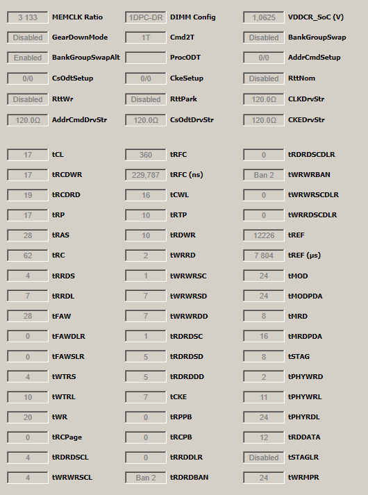3133 MHz тайминги от 2666 MHz (466 MHz разница) CL-RCD-RP-RAS - 17-19-17-28 CR1