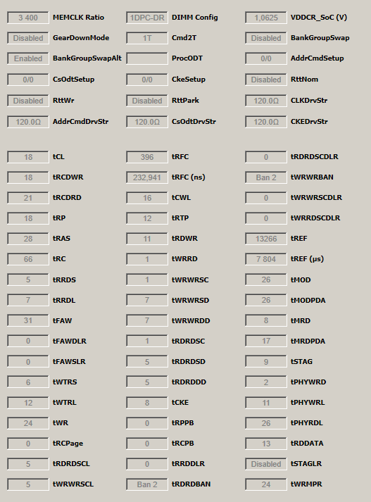 * 3400 MHz тайминги взяты 3333 с небольшими правками, настроен только для прохождения теста SiSoftware Sandra, работа с ошибками при интенсивных тестах ОЗУ.