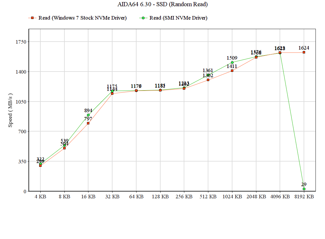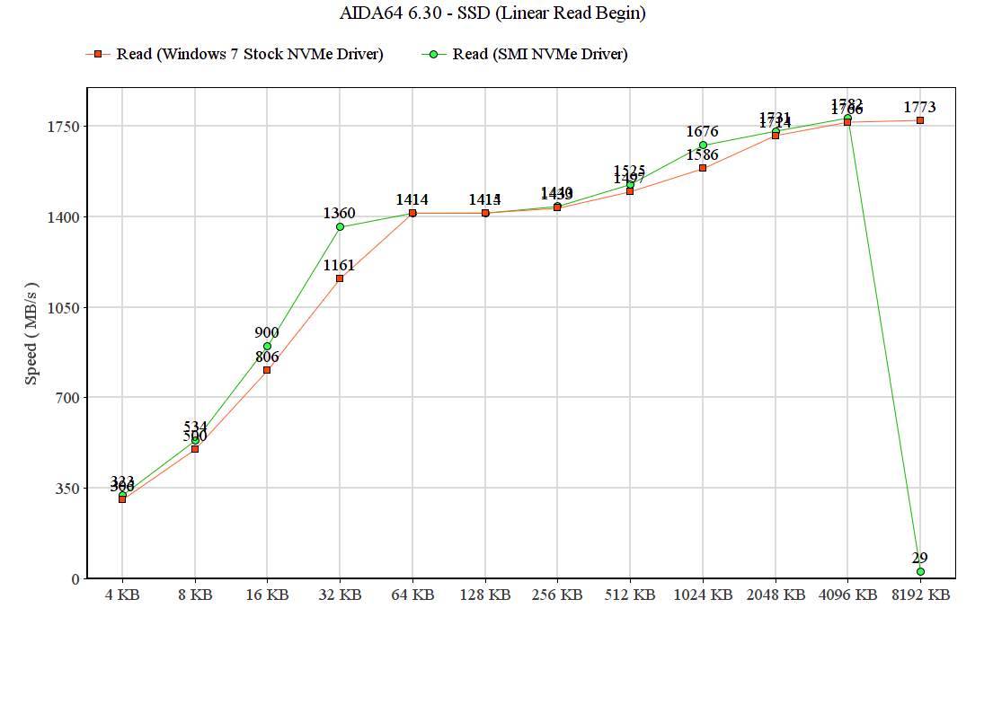 После некоторого количества тестов и переходов между стандартным NVM драйвером и SMI драйвером, скорость чтения в AIDA64 упала с ~2640 до ~1720 МБ в секунду, вероятно отвалился "костыль" HMB, но это не точно.