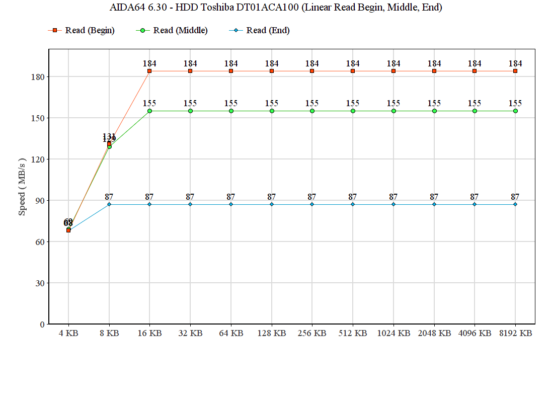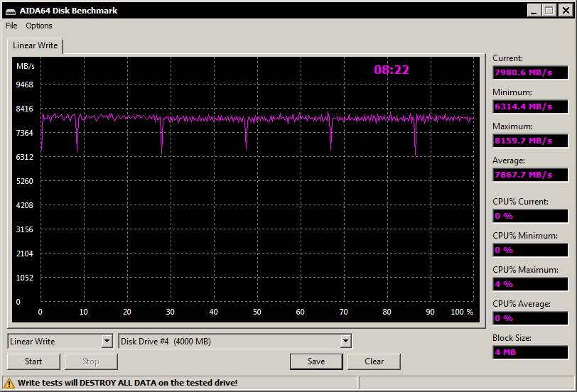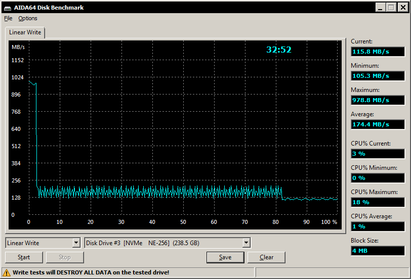 Итоговые скорости записи без помощи буфера оказались на уровне ~150 МБ/с, и ~115 МБ/с в конце теста записи.