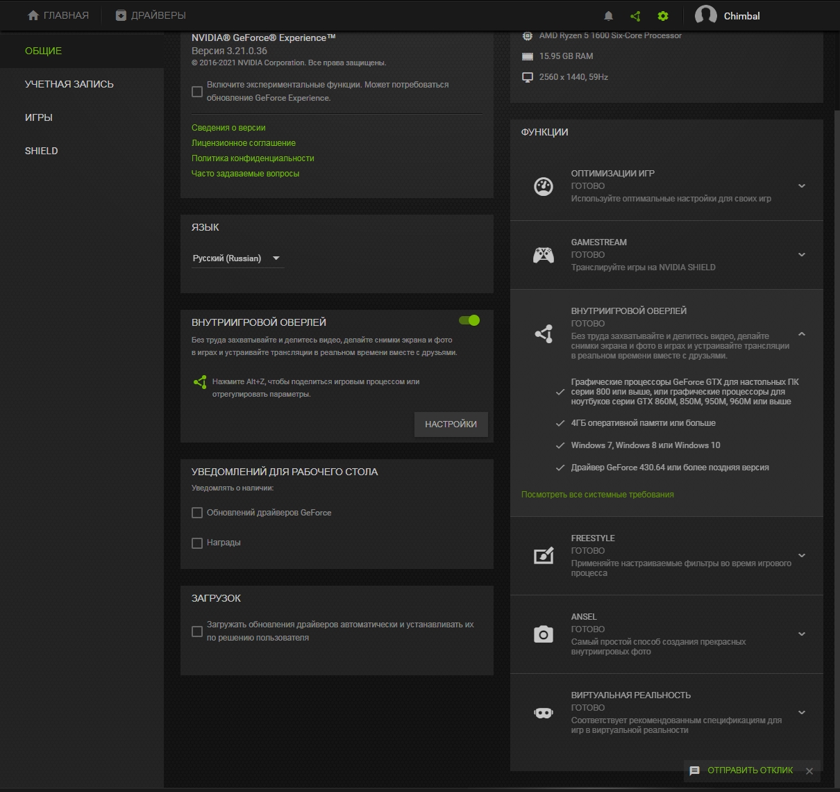 1) GeForce Experience: Это приложение выглядит для меня как неудачная попытка что-то создать, вроде и есть, а пользы нет, настраивать крайне неудобно, зачем-то все настройки вынесли в оверлей и разбросали по разным разделам, куча пунктов в окне GeForce Experience чисто для информации которая бесполезна (версия GeForce Experience что меняется принудительными обновлениями независимо от пользователя, и т.п.).