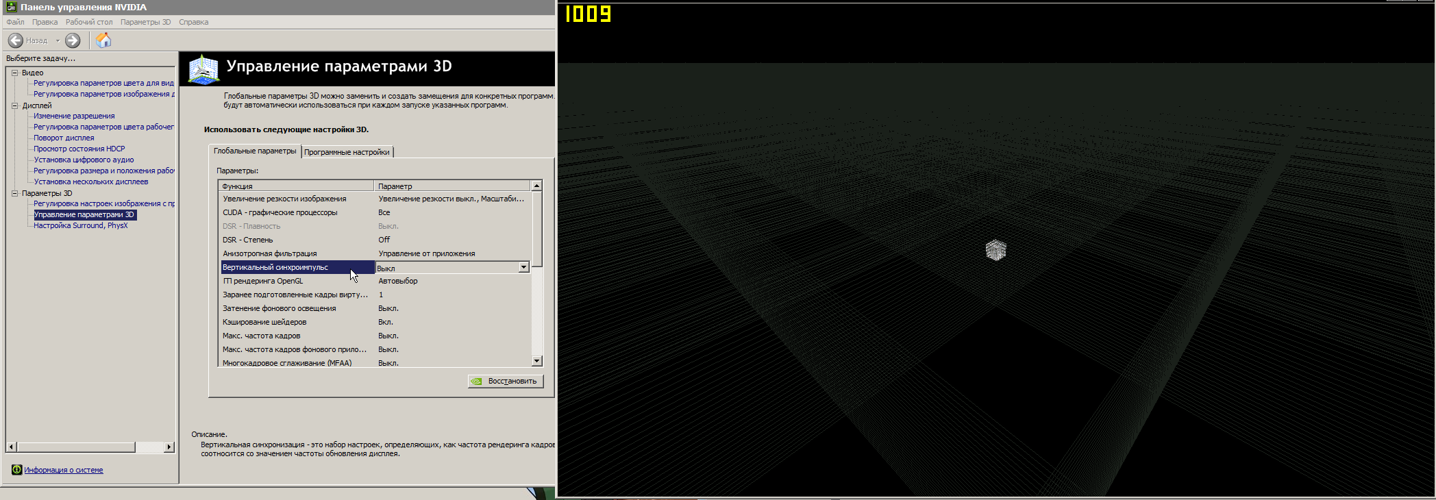 Следующие скриншоты более чем наглядно демонстрируют проблему, на уровне исходного кода вертикальная синхронизация не включена, но, несмотря на стандартную настройку драйвер её включает, в случае AMD все работает как положено.