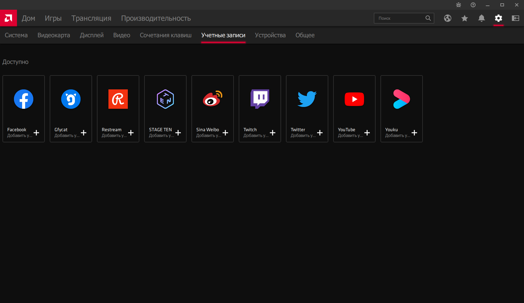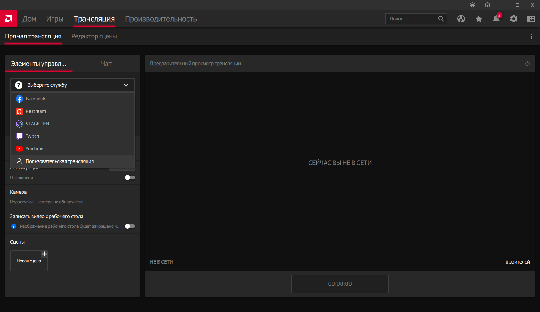 Самая приятная часть работы над статьей, ибо никаких проблем не возникло при создании этой части, сразу бросается в глаза функционал прямой трансляции, который значительно богаче чем у nVidia.