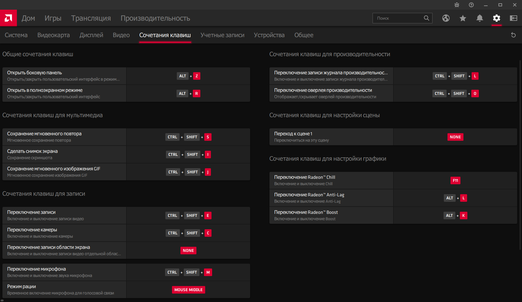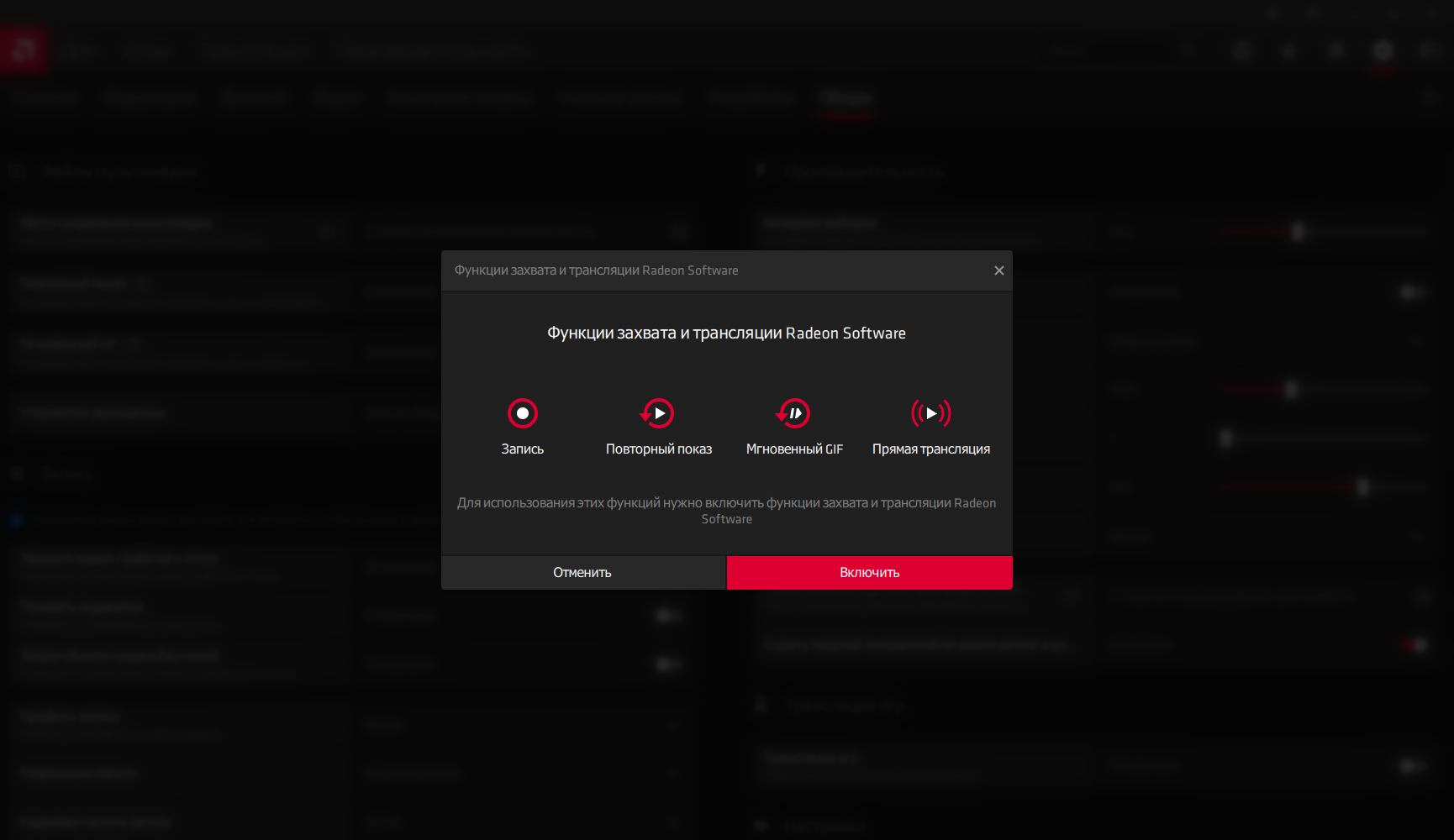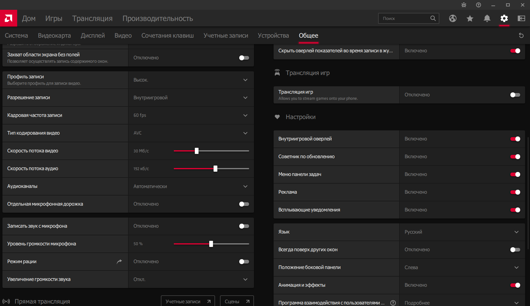 AMD: В пределах окна можно выбрать микрофон, параметры записи/трансляции аудио/видео, места сохранения записей, галочка разрешающая запись видео с рабочего стола и т.п.